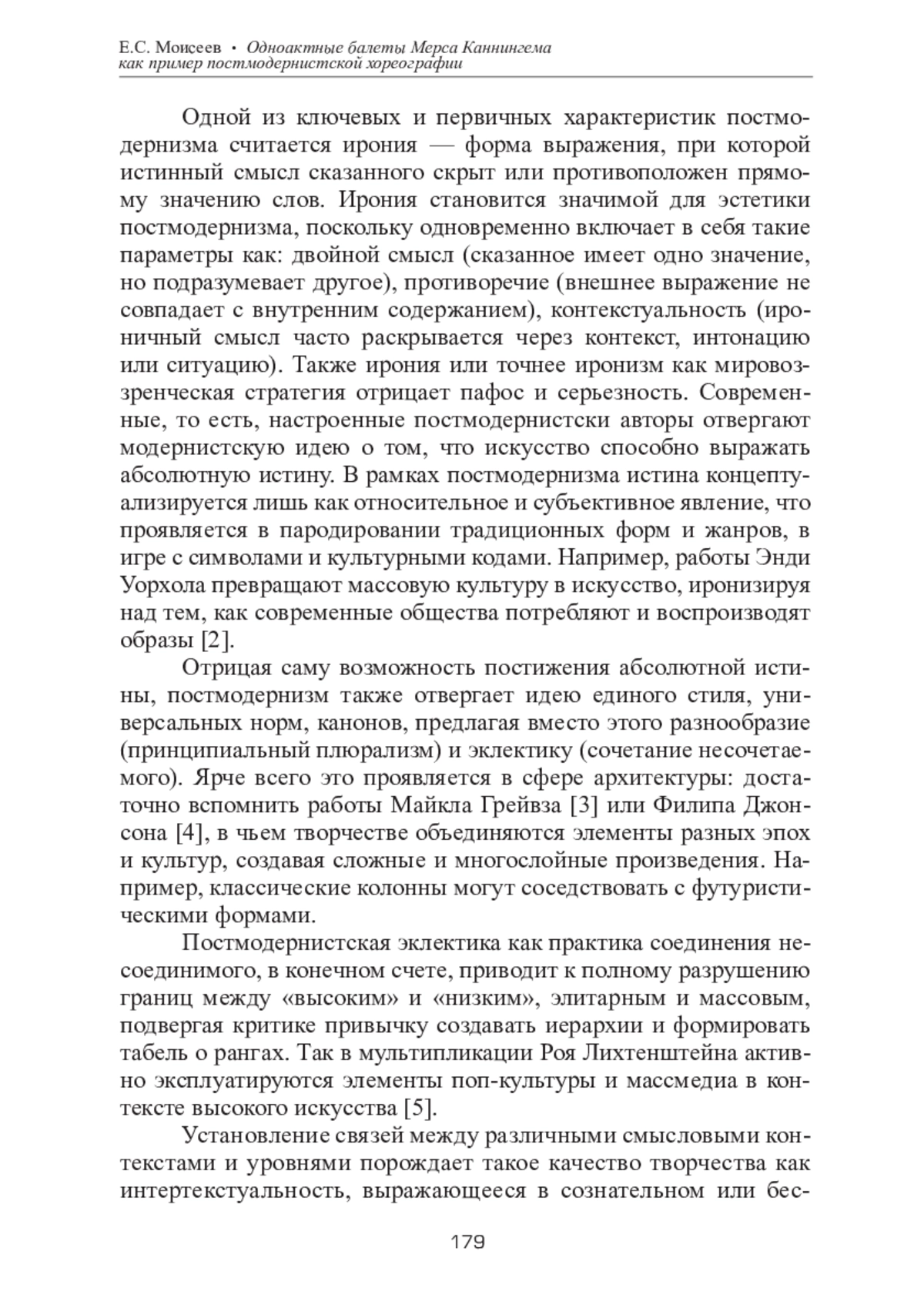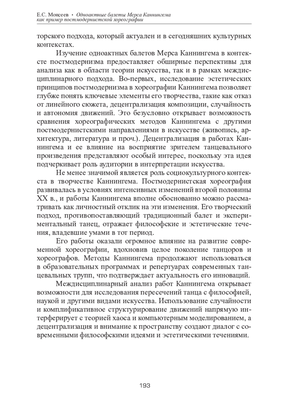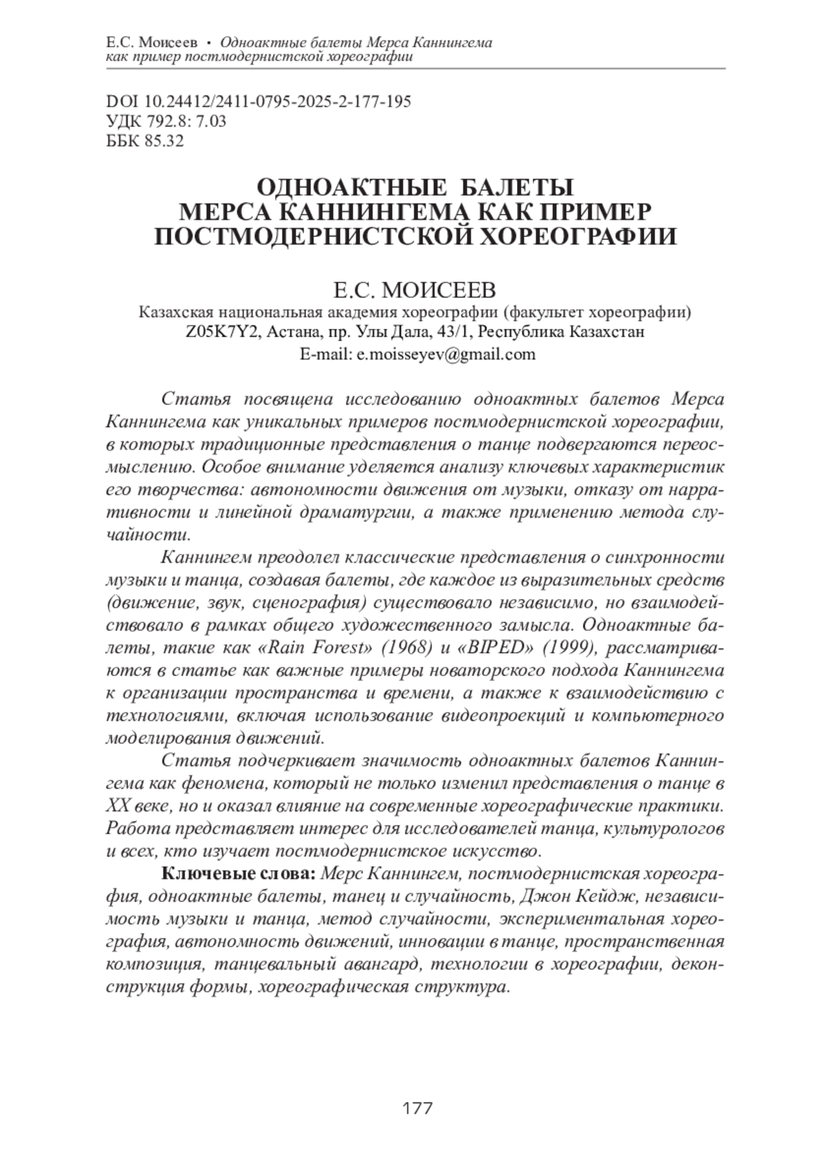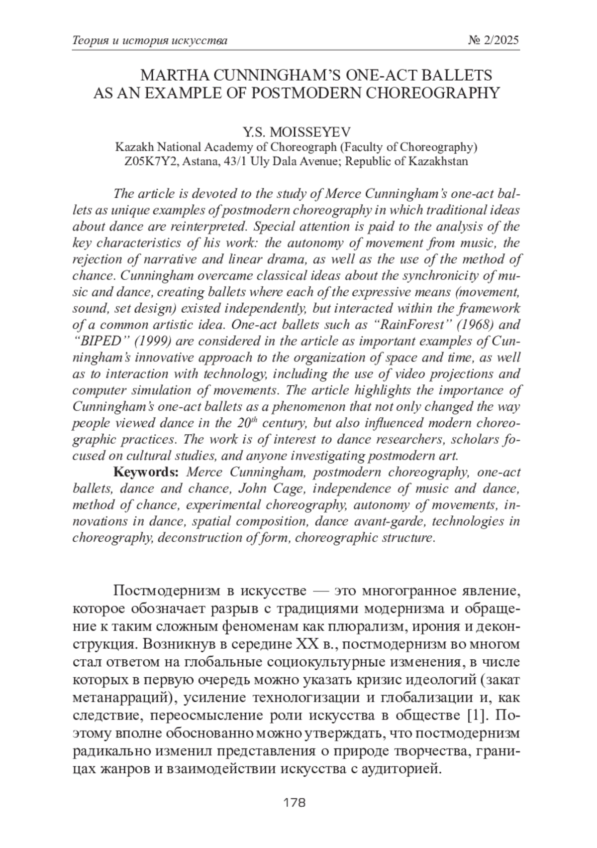 Статья посвящена исследованию одноактных балетов Мерса Каннингема как уникальных примеров постмодернистской хореографии, в которых традиционные представления о танце подвергаются переосмыслению. Особое внимание уделяется анализу ключевых характеристик его творчества: автономности движения от музыки, отказу от нарративности и линейной драматургии, а также применению метода случайности. Каннингем преодолел классические представления о синхронности музыки и танца, создавая балеты, где каждое из выразительных средств (движение, звук, сценография) существовало независимо, но взаимодействовало в рамках общего художественного замысла. Одноактные балеты, такие как «Rain Forest» (1968) и «BIPED» (1999), рассматриваются в статье как важные примеры новаторского подхода Каннингема к организации пространства и времени, а также к взаимодействию с технологиями, включая использование видеопроекций и компьютерного моделирования движений. Статья подчеркивает значимость одноактных балетов Каннингема как феномена, который не только изменил представления о танце в XX веке, но и оказал влияние на современные хореографические практики. Работа представляет интерес для исследователей танца, культурологов и всех, кто изучает постмодернистское искусство