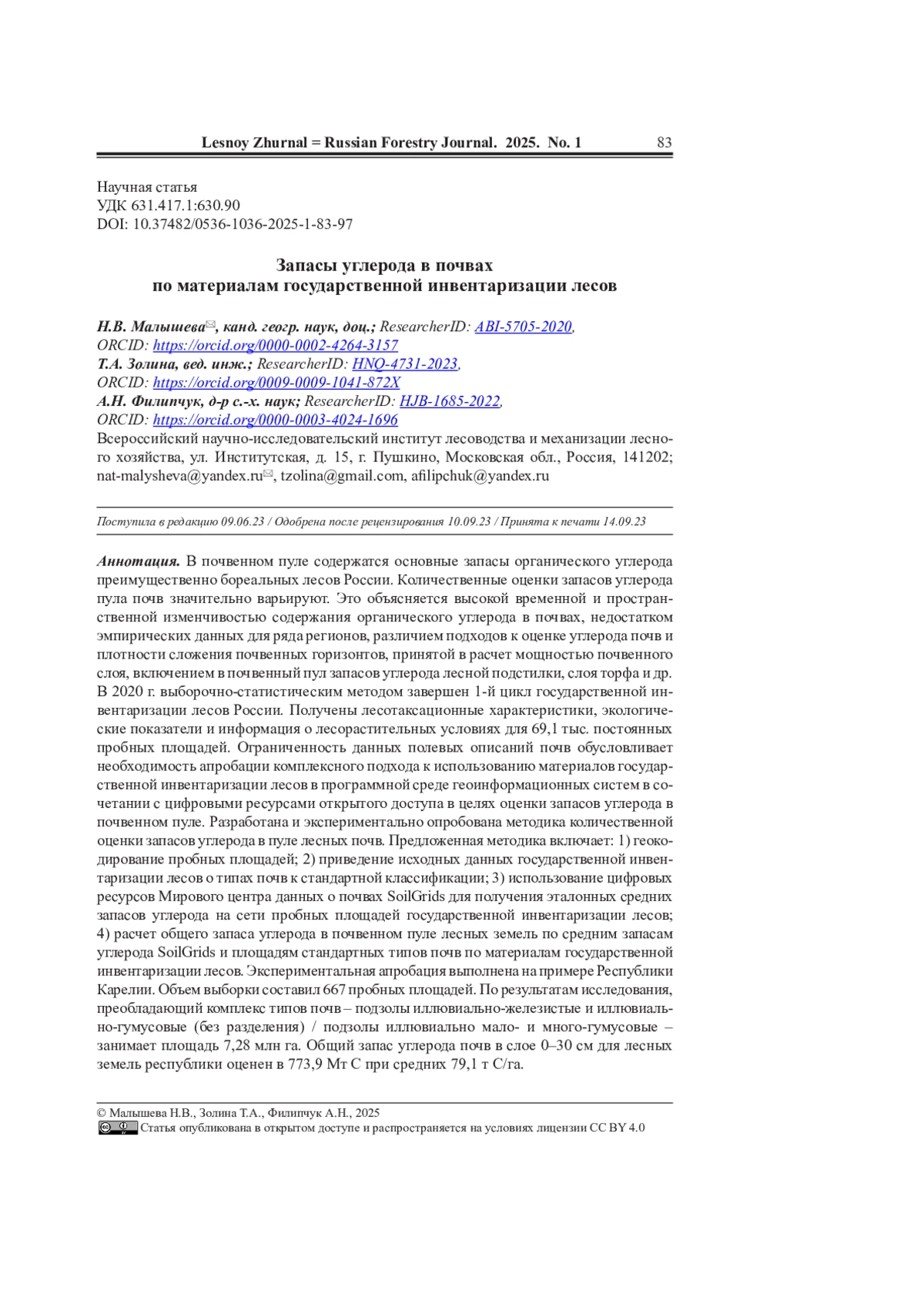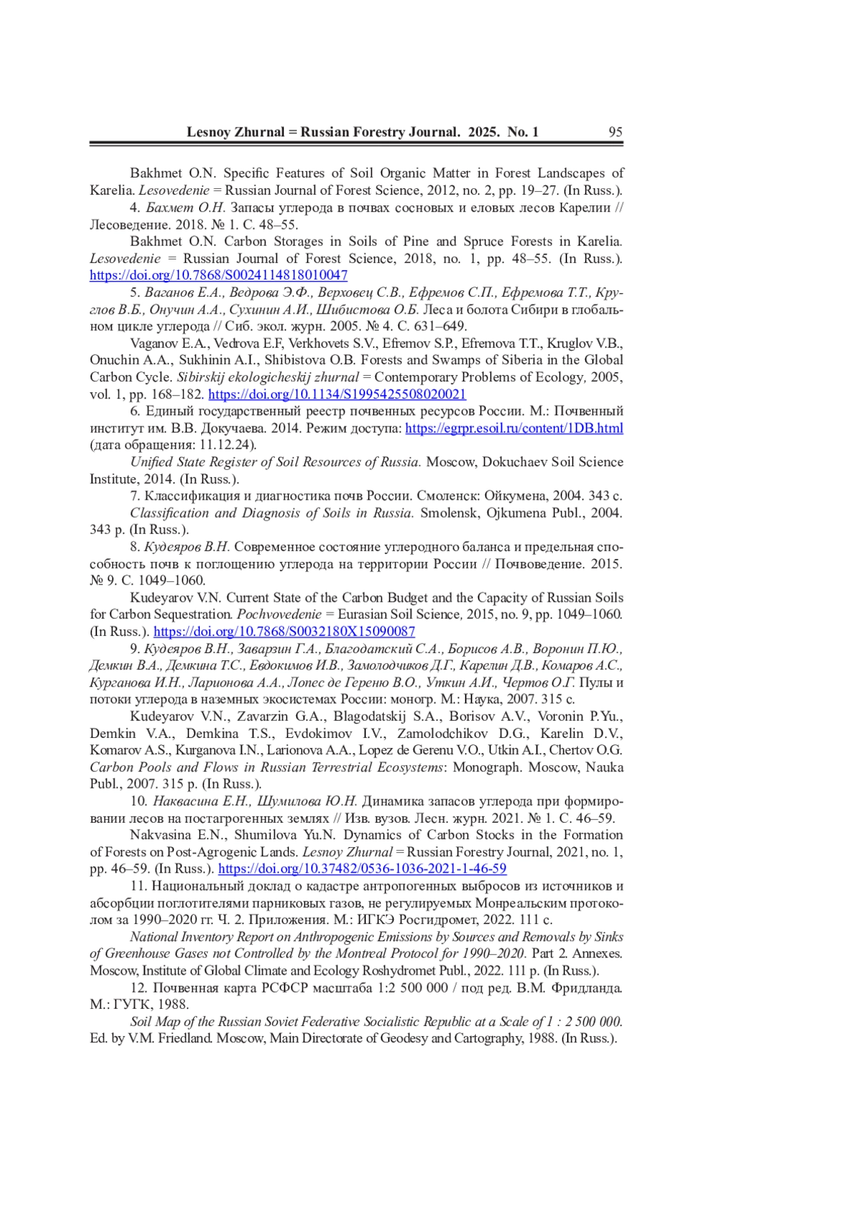 4. Бахмет О.Н. Запасы углерода в почвах сосновых и еловых лесов Карелии // Лесоведение. 2018. No 1. С. 48-55. EDN: YMNLUG