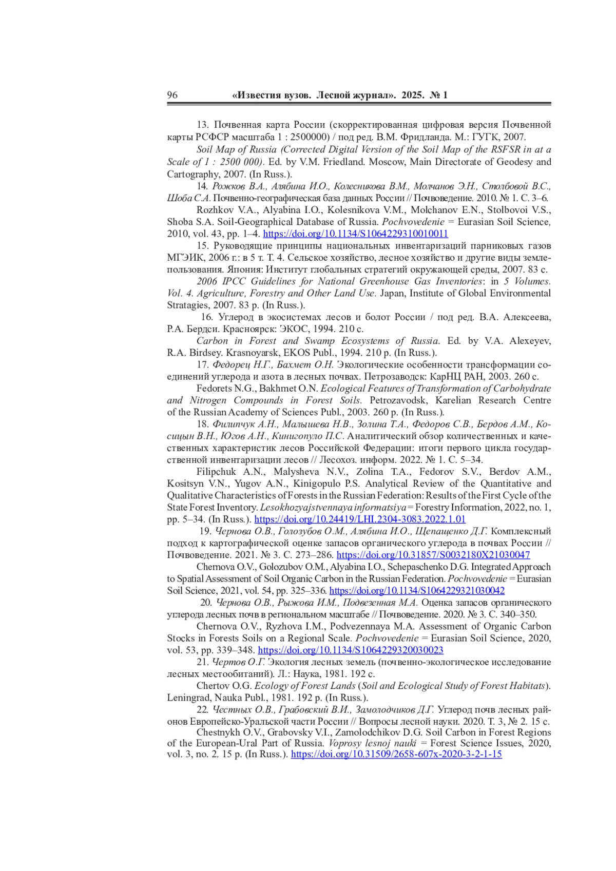 20. Чернова О.В., Рыжова И.М., Подвезенная М.А. Оценка запасов органического углерода лесных почв в региональном масштабе // Почвоведение. 2020. No 3. С. 340-350.