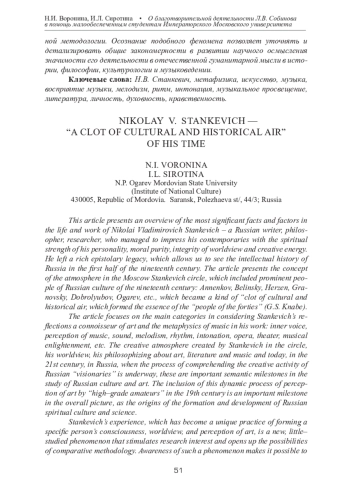 Настоящая статья представляет обзор наиболее значимых фактов и факторов в жизни и творчестве Николая Владимировича Станкевича — русского литератора, философа, исследователя, который сумел поразить современников духовной силой личности, нравственной чистотой, цельностью мировосприятия и творческой энергией. Он оставил богатое эпистолярное наследие, что позволяет увидеть интеллектуальную историю России первой половины ХIХ в. В статье построена концепция атмосферы в московском кружке Станкевича, куда входили выдающиеся люди русской культуры ХIХ в.: Анненков, Белинский, Герцен, Грановский, Добролюбов, Огарев и др., ставшая своеобразным «сгустком культурно-исторического воздуха, который составил существо “люди сороковых годов”» (Г. С. Кнабе). В статье акцентируются основные категории в рассмотрении размышлений Станкевича как ценителя искусства и метафизики музыки в его творчестве: внутренний голос, восприятие музыки, звук, мелодизм, ритм, интонация, опера, театр, музыкальное просвещение и др. Творческая атмосфера, созданная Станкевичем в кружке, его мировоззрение, его философствование об искусстве, литературе и музыке и сегодня, в ХХI в. в России, когда идет процесс осмысления созидательной деятельности русских «духовидцев», – это важные смысловые вехи в изучении российской культуры и искусства. Включение этого динамичного процесса восприятия искусства «дилетантами высокой пробы» в ХIХ в. – важные вехи в общей картине, как истоки становления и развития отечественной духовной культуры и науки. Опыт Станкевича, ставший уникальной практикой формирования конкретным человеком своего сознания, мировоззрения, восприятия искусства, — новое, малоизученное явление, которое стимулирует исследовательский интерес, открывает возможности сравнительно-сопоставительной методологии. Осознание подобного феномена позволяет уточнять и детализировать общие закономерности в развитии научного осмысления значимости его деятельности в отечественной гуманитарной мысли в истории, философии, культурологии и музыковедении