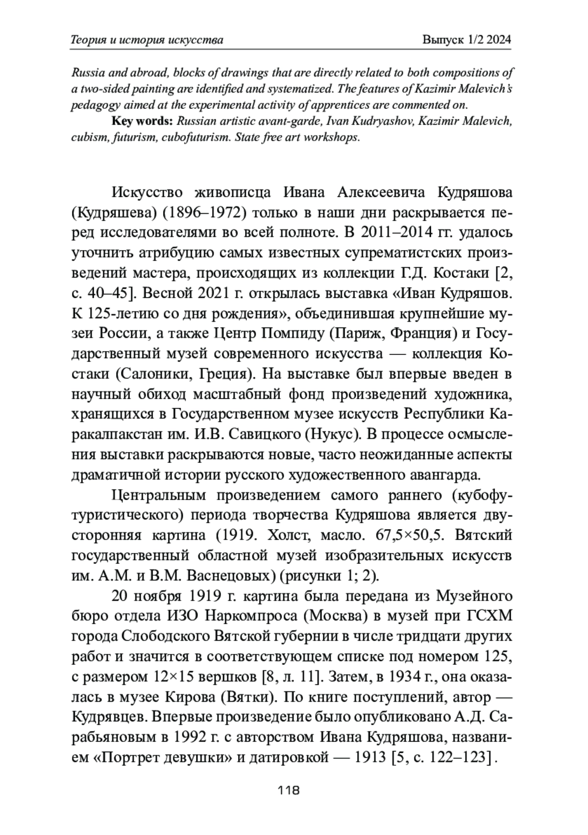 Искусство живописца Ивана Алексеевича Кудряшова (Кудряшева) (1896–1972) только в наши дни раскрывается перед исследователями во всей полноте. В 2011–2014 гг. удалось уточнить атрибуцию самых известных супрематистских произведений мастера, происходящих из коллекции Г. Д. Костаки [2, c. 40–45]. Весной 2021 г. открылась выставка «Иван Кудряшов. К 125-летию со дня рождения», объединившая крупнейшие музеи России, а также Центр Помпиду (Париж, Франция) и Государственный музей современного искусства — коллекция Костаки (Салоники, Греция). На выставке был впервые введен в научный обиход масштабный фонд произведений художника, хранящихся в Государственном музее искусств Республики Каракалпакстан им. И. В. Савицкого (Нукус). В процессе осмысления выставки раскрываются новые, часто неожиданные аспекты драматичной истории русского художественного авангарда.