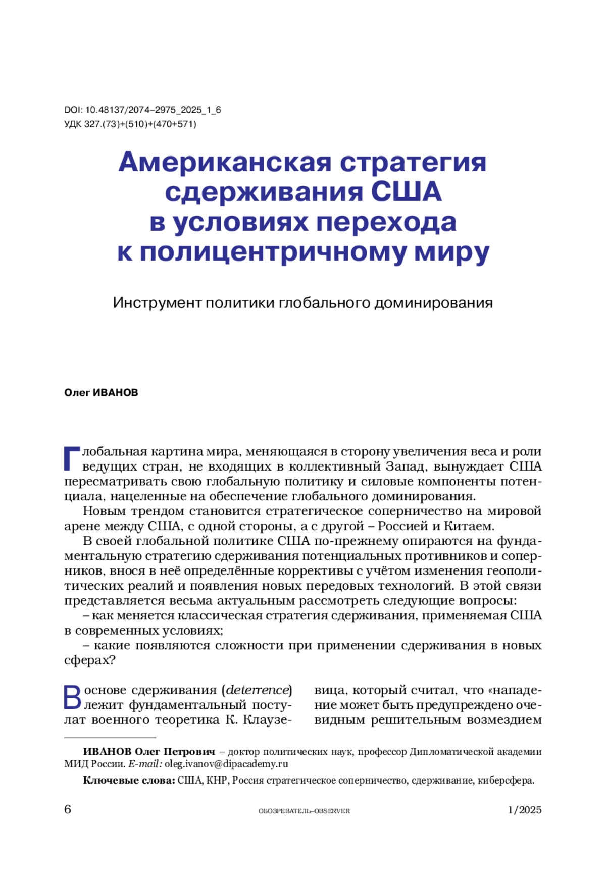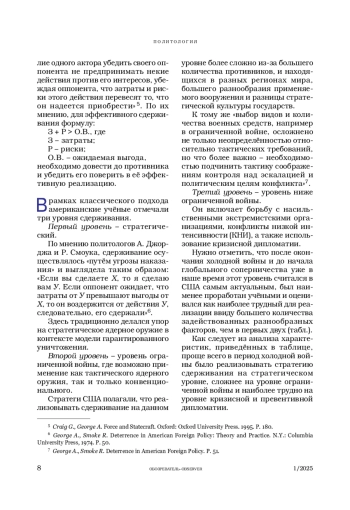 1. Иванов О. Американский взгляд на стратегическое соперничество и роль военной силы // Обозреватель-Observer. 2024. № 2. С. 27-36.