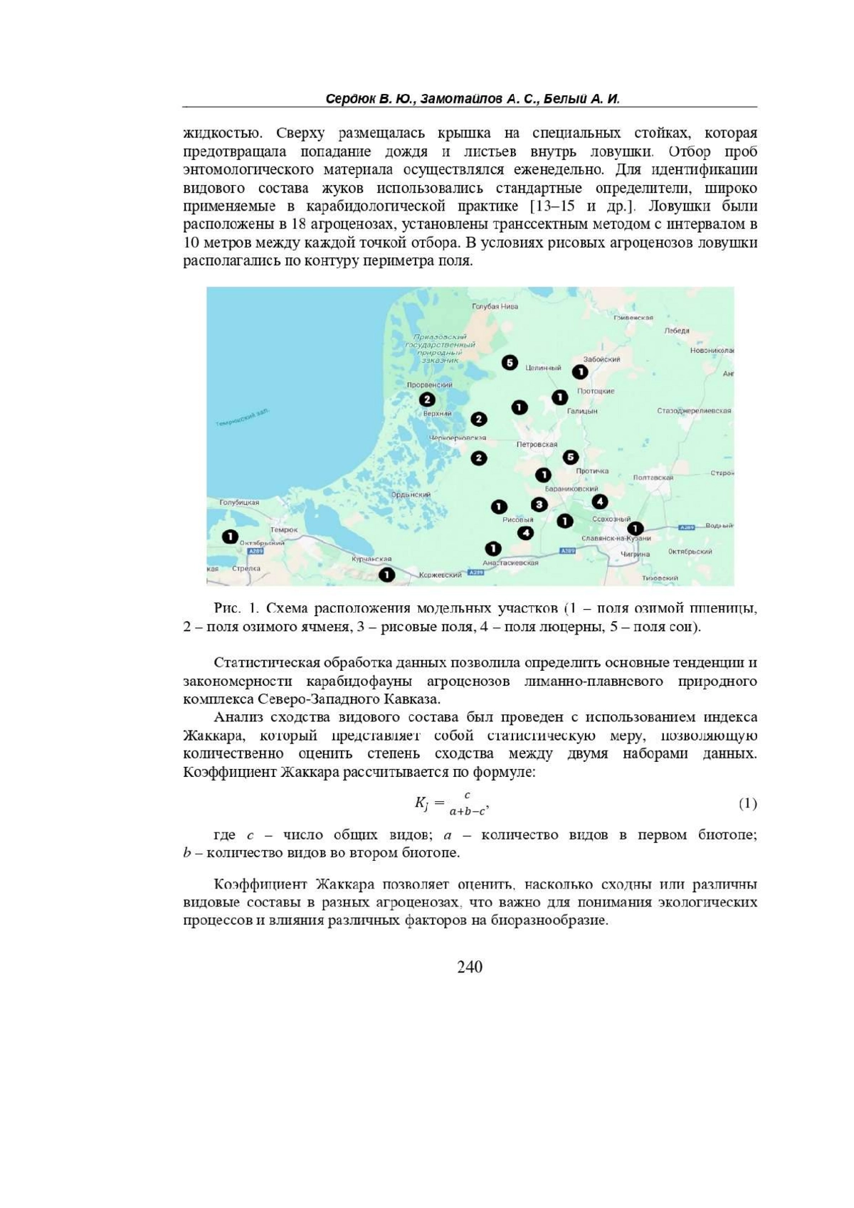 Проведен эколого-фаунистический анализ жуков-жужелиц (Coleoptera, Carabidae) в агроценозах Краснодарского края, направленный на изучение видового состава, распределения и экологических особенностей этих насекомых в условиях сельскохозяйственных ландшафтов региона. Установлен видовой состав карабид на полях озимой пшеницы, озимого ячменя, сои, люцерны 2-го года и рисовых полях. Всего обнаружен 51 вид жуков из 28 родов и 16 триб. Наибольшее видовое разнообразие отмечено на полях пшеницы (38 видов) и ячменя (24 вида). Выявлено 23 доминирующих вида жужелиц, среди которых: Carabus exaratus, C. cumanus, C. campestris, Brachinus crepitans, Poecilus cupreus, Pterostichus niger, Calathus distinguendus, C. fuscipes, C. erratus, C. halensis, C. melanocephalus, Amara aenea, A. lucida, Zabrus tenebrioides, Harpalus distinguendus, H. rufipes, H. tardus, H. affinis, Ophonus azureus, Callistus lunatus, Dinodes decipiens, Chlaenius aeneocephalus, Ch. nitidulus. По гигропреферендуму Carabidae в исследуемом районе относятся к мезофилам, мезо-ксерофилам, мезогигрофилам и гигрофилам. В спектре жизненных форм жужелиц основную массу составляли миксофитофаги геохортобионты гарпалоидные и зоофаги стратобионты-скважники поверхностно-подстилочные, стратобионты зарывающиеся подстилочно-почвенные, стратобионты-скважники подстилочные. Установлена степень сходства видового состава жужелиц, между полями сельскохозяйственных культур.