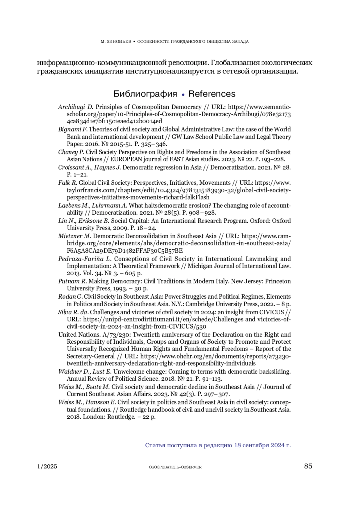 3. Chaney P. Civil Society Perspective on Rights and Freedoms in the Association of Sontheast Asian Nations // EUROPEAN journal of EAST Asian studies. 2023. № 22. Р. 193-228.