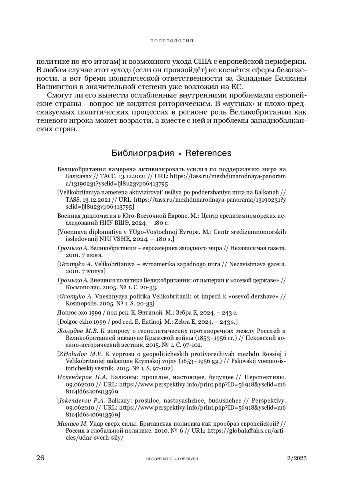 ПОНОМАРЕВА Е. Г. ВЕЛИКОБРИТАНИЯ НА БАЛКАНАХ: ПОЛИТИКА ПРИСУТСТВИЯ В XXI ВЕКЕ // ОБОЗРЕВАТЕЛЬ. 2025. № 2