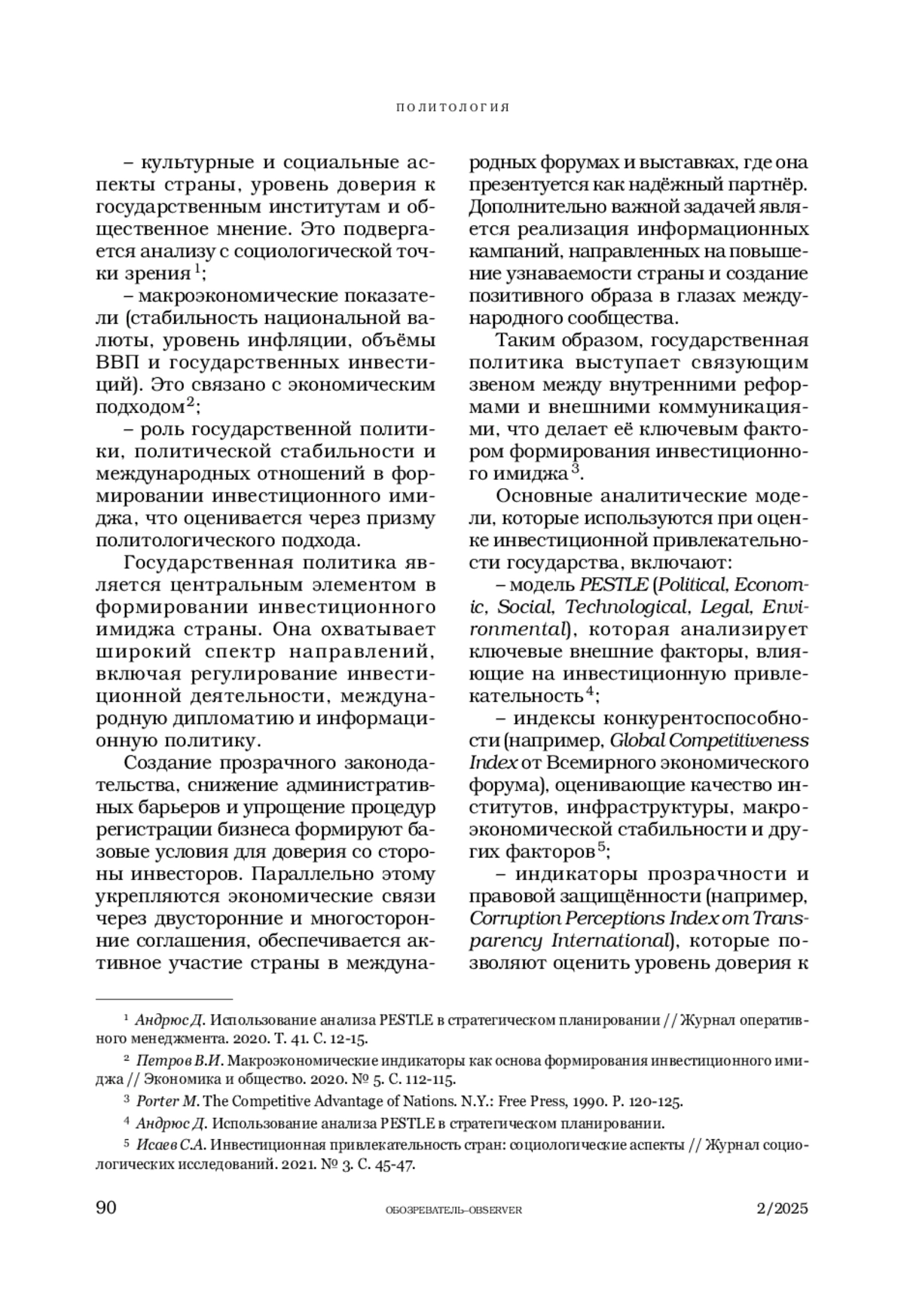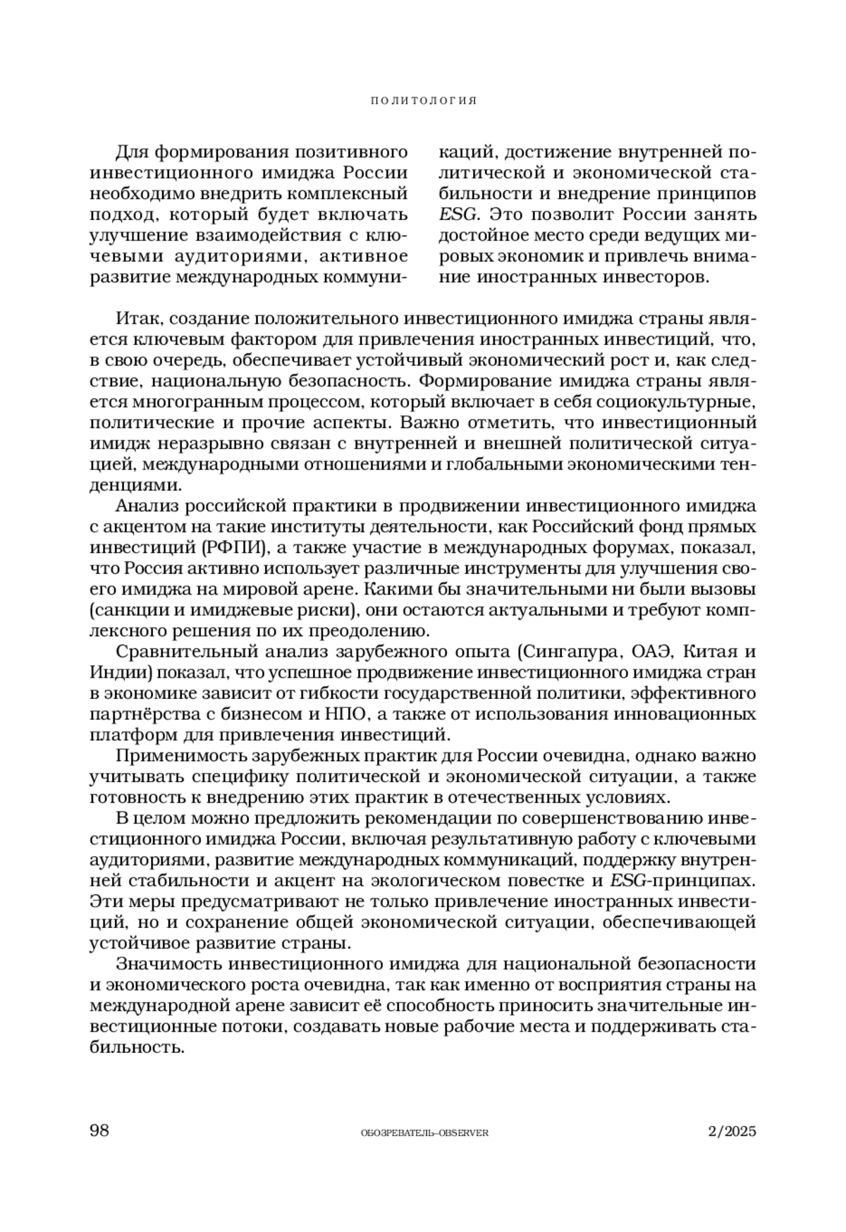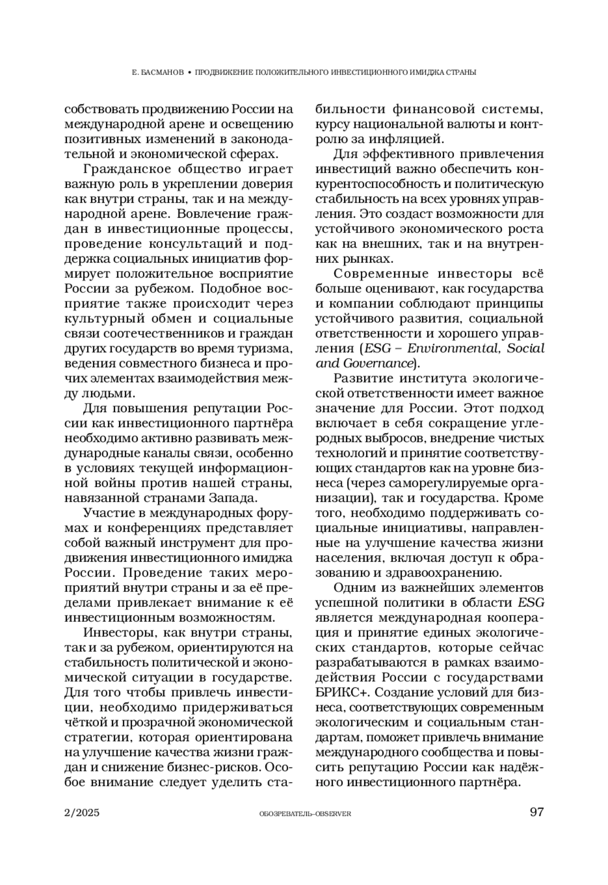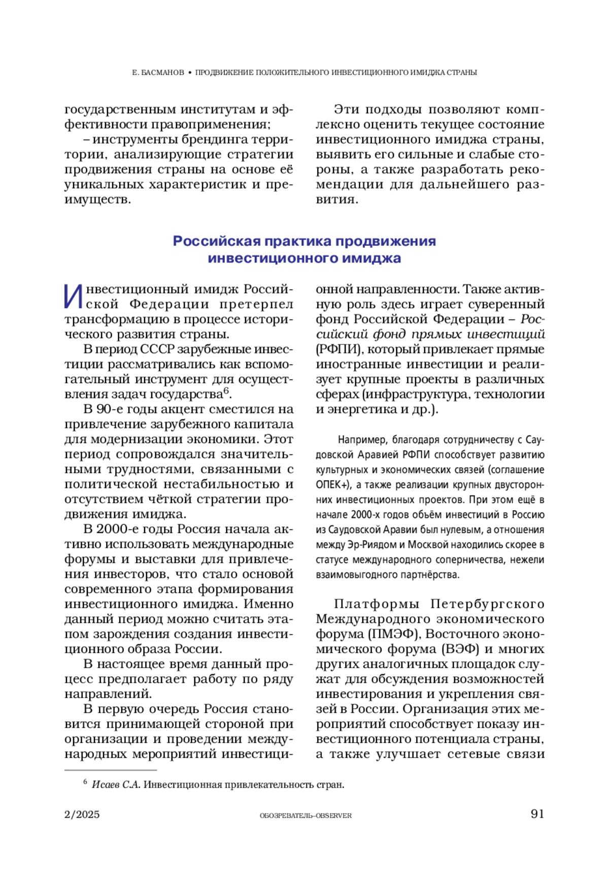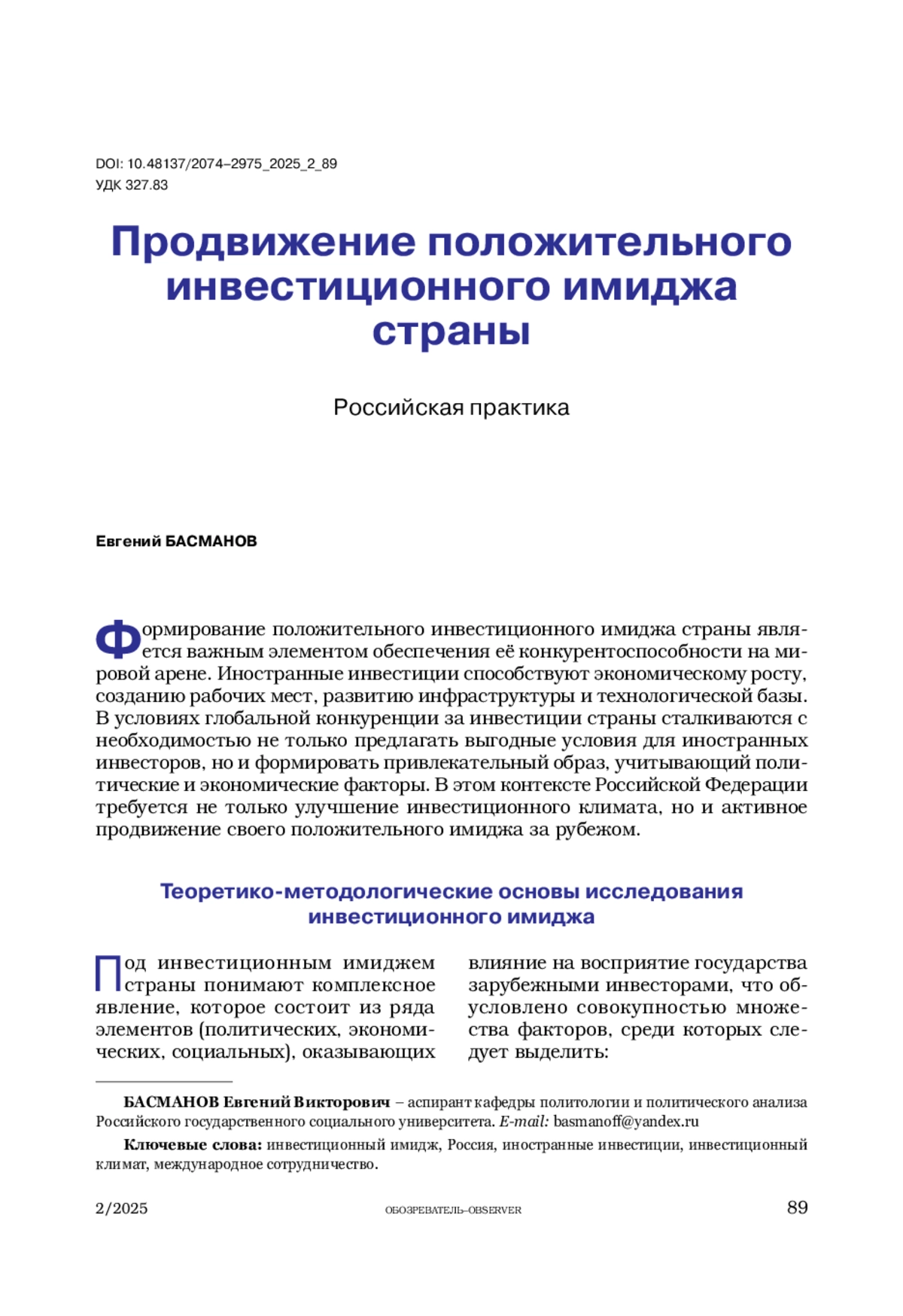 БАСМАНОВ Е. В. ПРОДВИЖЕНИЕ ПОЛОЖИТЕЛЬНОГО ИНВЕСТИЦИОННОГО ИМИДЖА СТРАНЫ. РОССИЙСКАЯ ПРАКТИКА // ОБОЗРЕВАТЕЛЬ. 2025. № 2