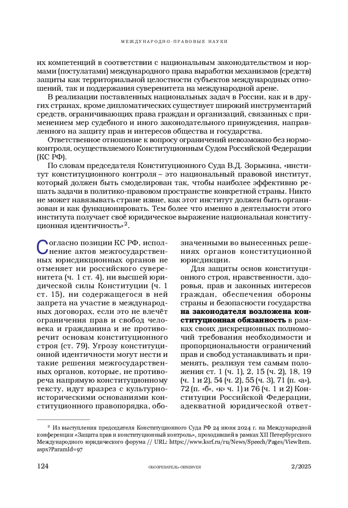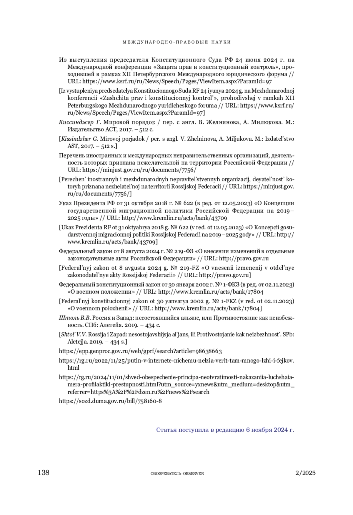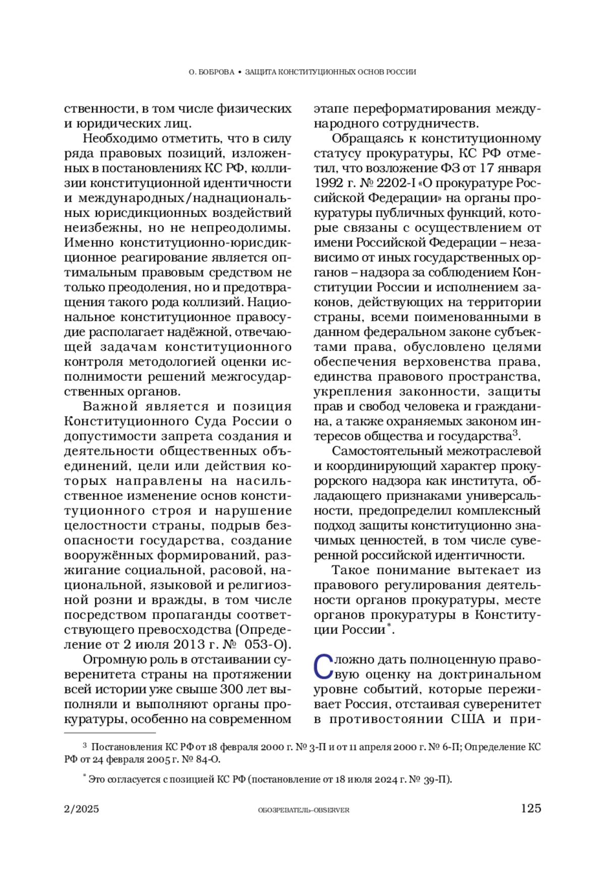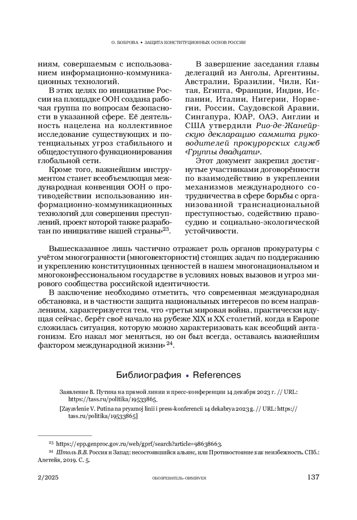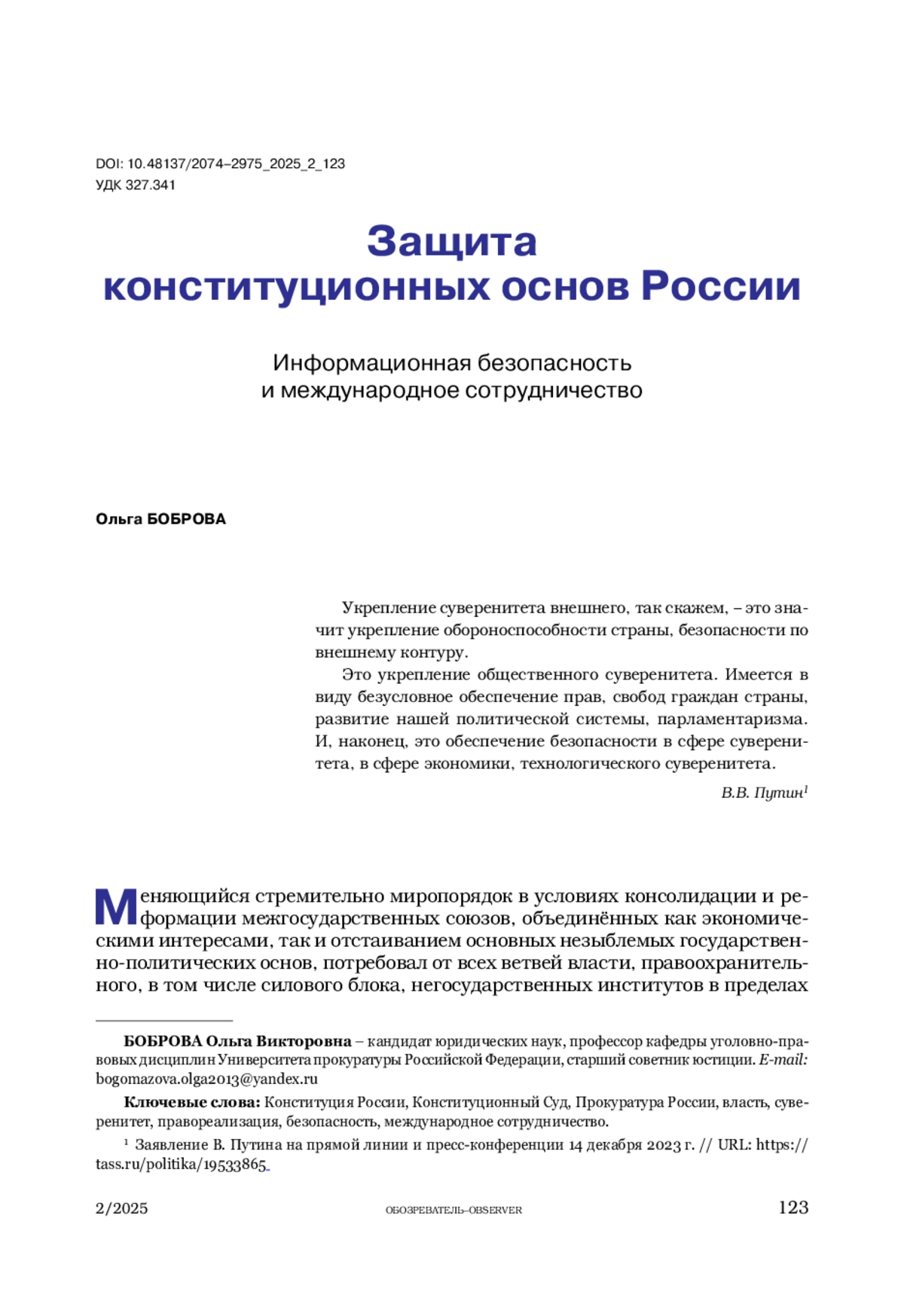 БОБРОВА О. В. ЗАЩИТА КОНСТИТУЦИОННЫХ ОСНОВ РОССИИ. ИНФОРМАЦИОННАЯ БЕЗОПАСНОСТЬ И МЕЖДУНАРОДНОЕ СОТРУДНИЧЕСТВО // ОБОЗРЕВАТЕЛЬ. 2025. № 2