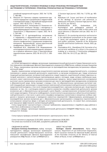 6. Манукян А.Р. Причины и формы проявления идеологии терроризма и экстремизма в подростковой и молодежной среде // Евразийский юридический журнал. 2022. № 8 (171). С. 410-411. EDN: OUEXXA