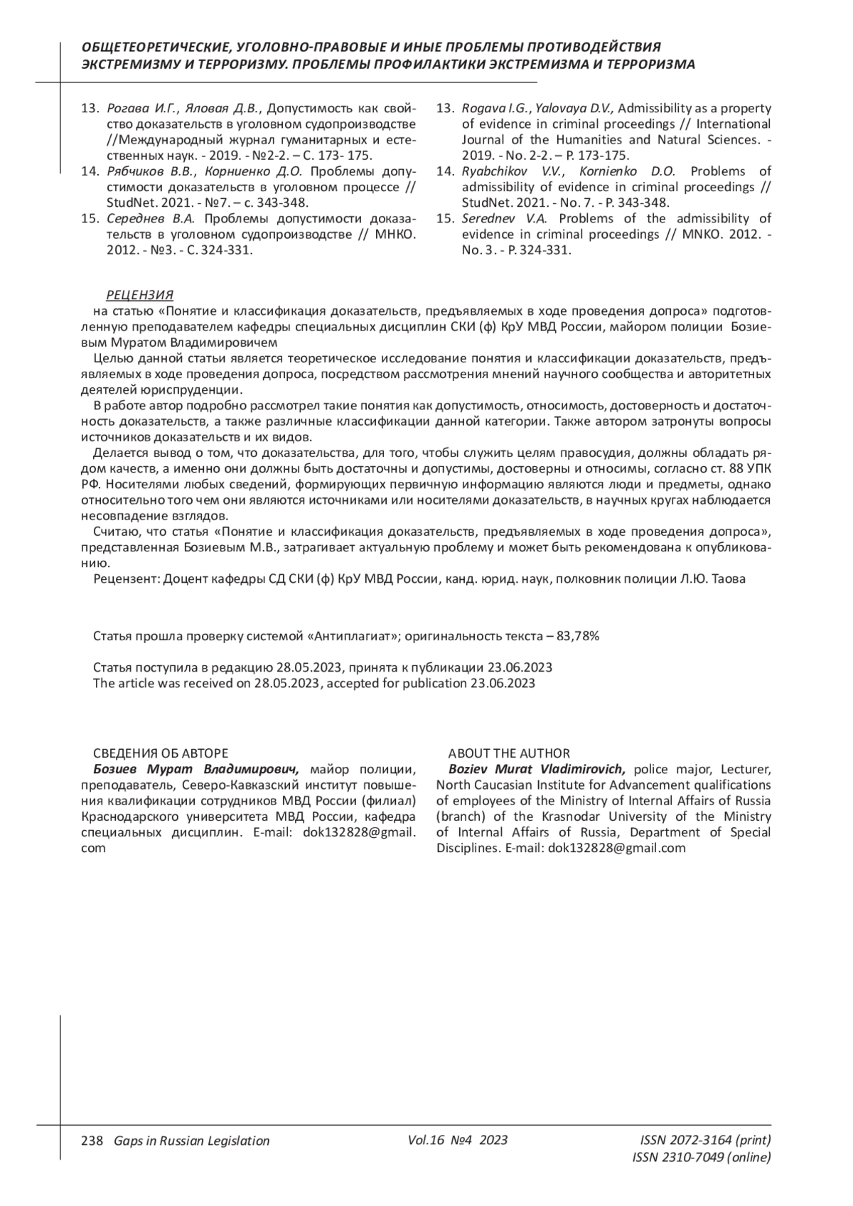 13. Рогава И.Г., Яловая Д.В., Допустимость как свойство доказательств в уголовном судопроизводстве //Международный журнал гуманитарных и естественных наук. - 2019. - №2-2. - С. 173- 175. EDN: YZEDOP