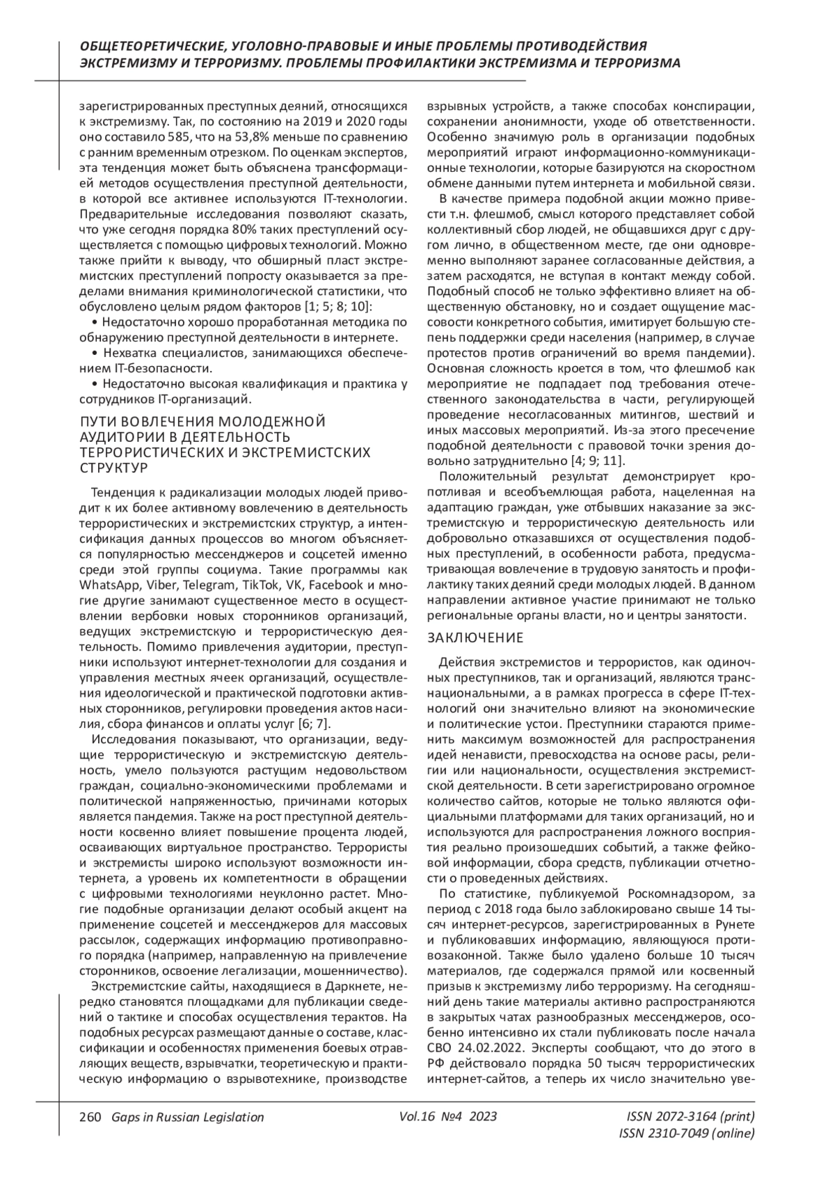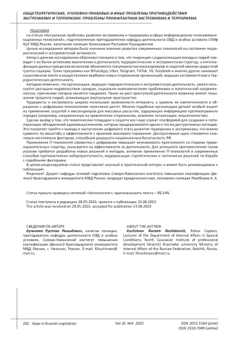 Takov A.Z. The spread of extremist ideology on the Internet: problems of detection and counteraction measures // Journal of Applied Research. 2022. No. 5-2. pp. 196-199.