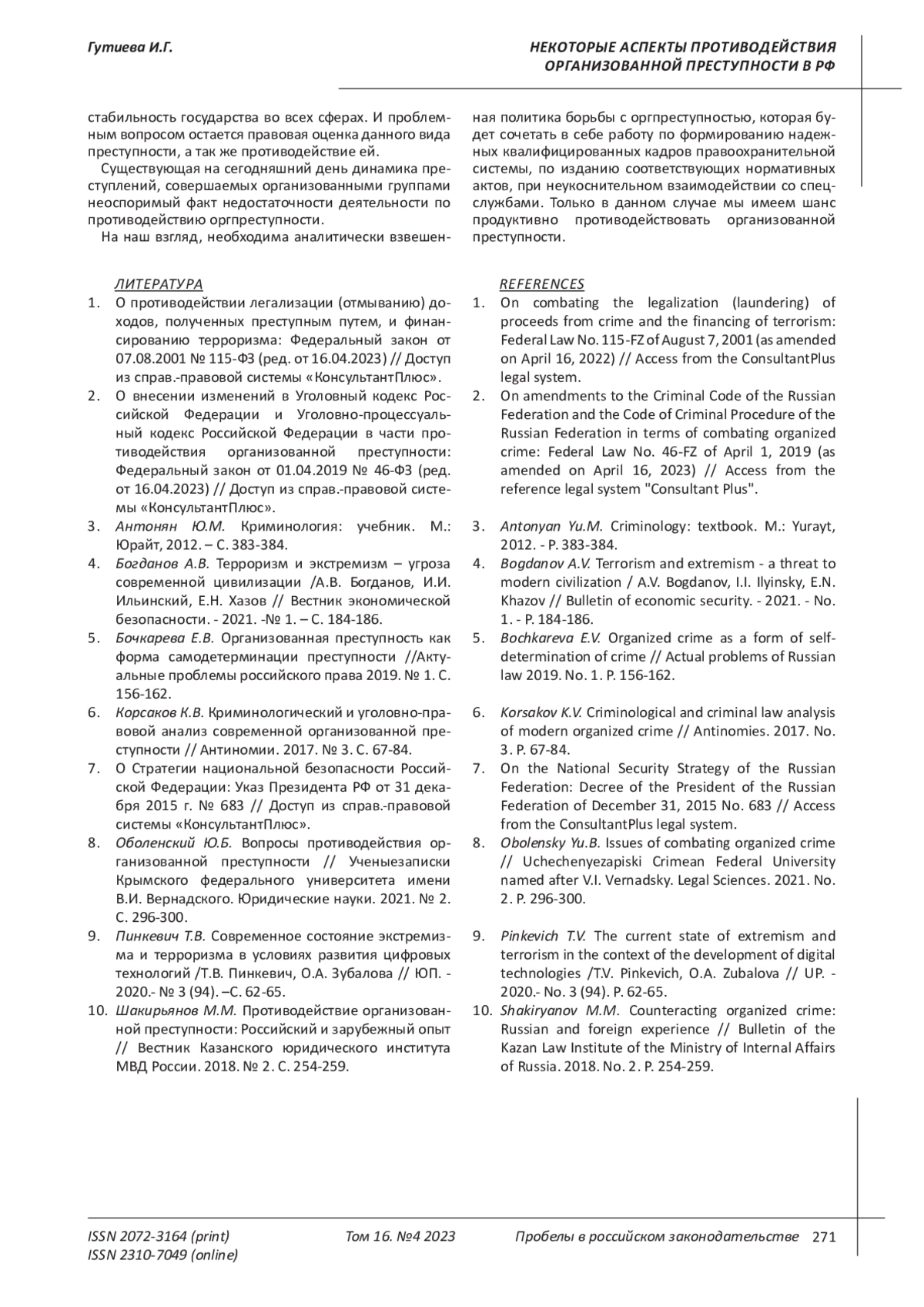 10. Шакирьянов М.М. Противодействие организованной преступности: Российский и зарубежный опыт // Вестник Казанского юридического института МВД России. 2018. № 2. С. 254-259. EDN: XQWDHV