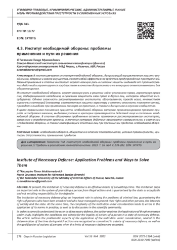 В настоящее время институт необходимой обороны, допускающий осуществление защиты своей жизни, здоровья и своего имущества, являет собой эффективное средство предупреждения преступлений. Рассматриваемый в статье институт играет важную роль в системе защиты индивида от противоправных действий и гарантируется государством в качестве допустимого и не влекущего ответственности для обороняющегося. Институт необходимой обороны играет важную роль в решении задач уголовного права, гарантируя права лиц, подвергнувшихся нападению, и сумевших защитить свои права и других лиц, интересы общества и государства. Однако сложность рассматриваемого института, обусловленная, прежде всего, множеством оценочных категорий (например, соответствие защиты характеру и степени опасности посягательства), приводят к ошибкам при применении его норм на практике, а также к дискуссиям в научном сообществе. В целях правильного понимания сущности необходимой обороны автором проанализирована правовая природа исследуемого явления, выделены условия и критерии правомерности действий лица в состоянии необходимой обороны. В статье обозначены проблемные аспекты применения рассматриваемого института, связанные с определением времени, в течение которого действия признаются совершенными в состоянии необходимой обороны, а также квалификацией действий лиц при превышении пределов необходимой обороны.