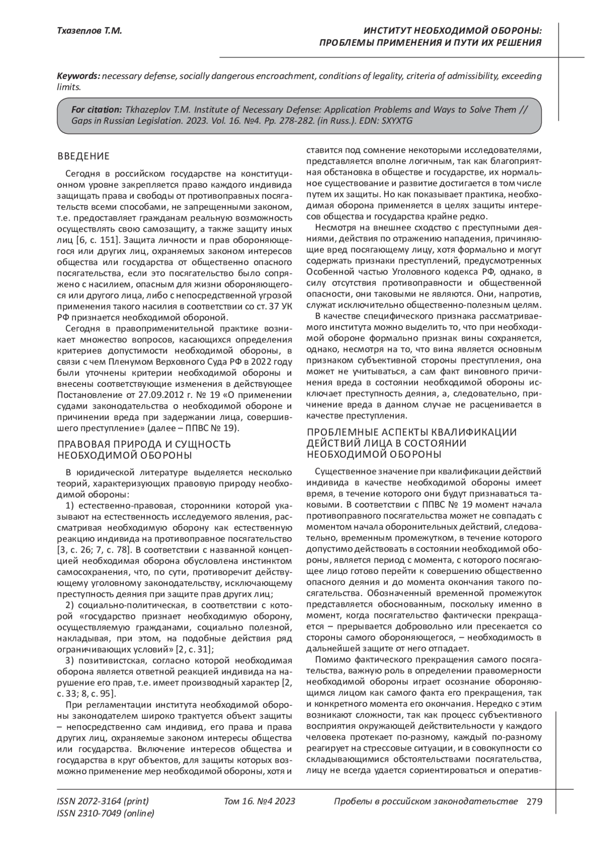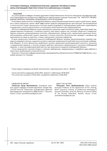 Reshnyak M.G. Separate problems of interpretation of the provisions of the criminal law on exceeding the limits of necessary defense in law enforcement practice // Gaps in Russian legislation. 2019. No. 3.