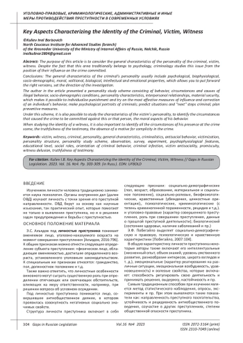 Ignatov A.N. Socio-demographic and criminal-legal characteristics of the personality of a modern violent criminal // Criminology: yesterday, today, tomorrow. Journal of the St. Petersburg International Criminological Club. - 2015. - No. 4 (39). - P. 93-98.
