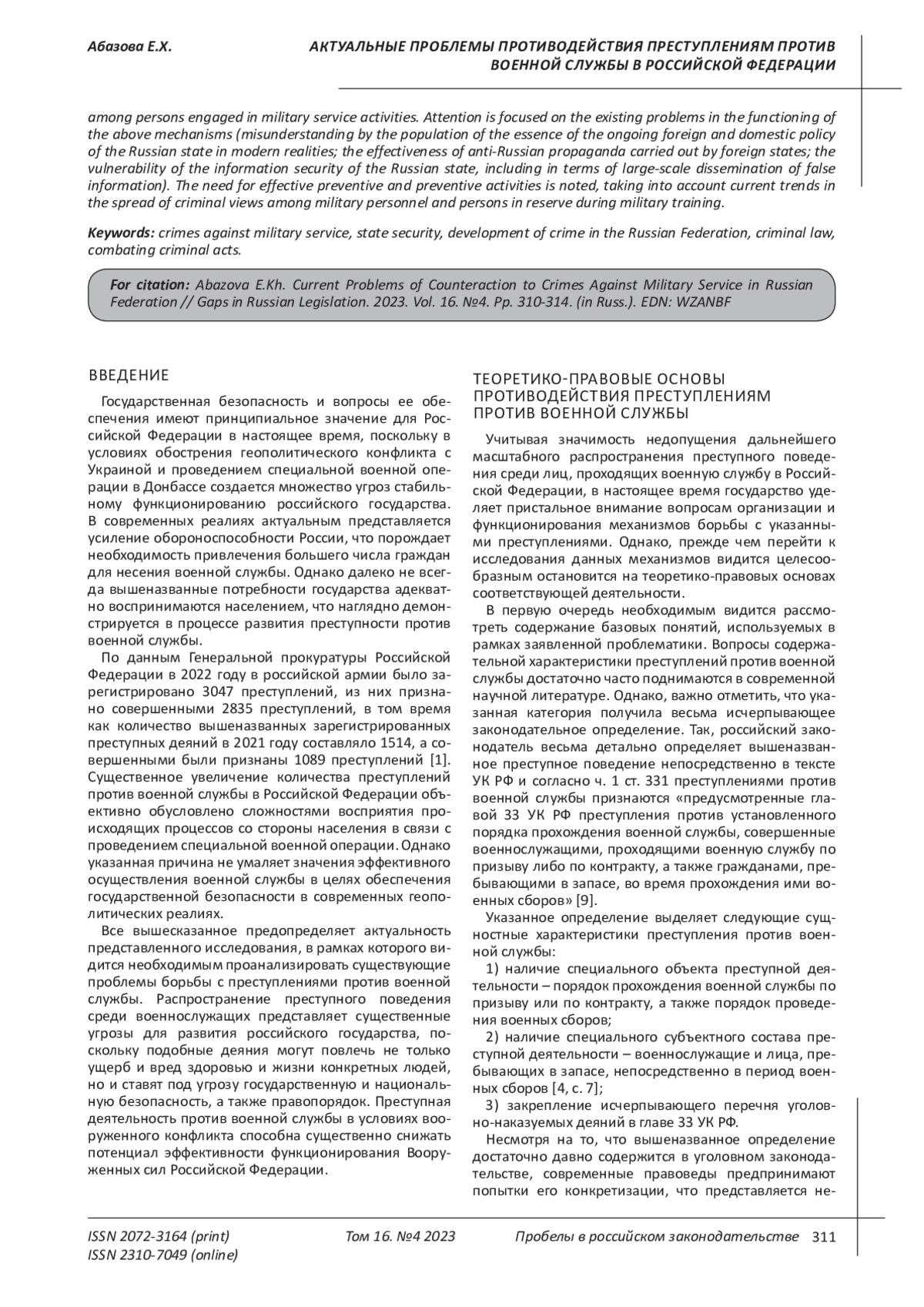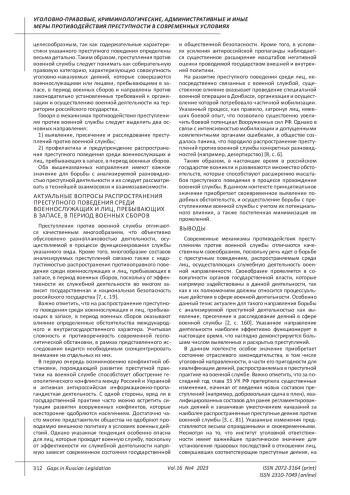 2. Ермолович Я.Н. Анализ статистических показателей судимости военнослужащих Российской Федерации за преступления против военной службы в 2021 г. // Военное право. 2023. № 1 (77). С. 158-164. EDN: FEQZAX