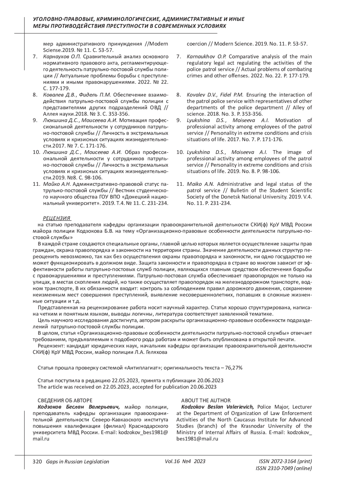 7. Карнаухов О.П. Сравнительный анализ основного нормативного правового акта, регламентирующего деятельность патрульно-постовой службы полиции // Актуальные проблемы борьбы с преступлениями и иными правонарушениями. 2022. № 22. С. 177-179. EDN: FJTQND
