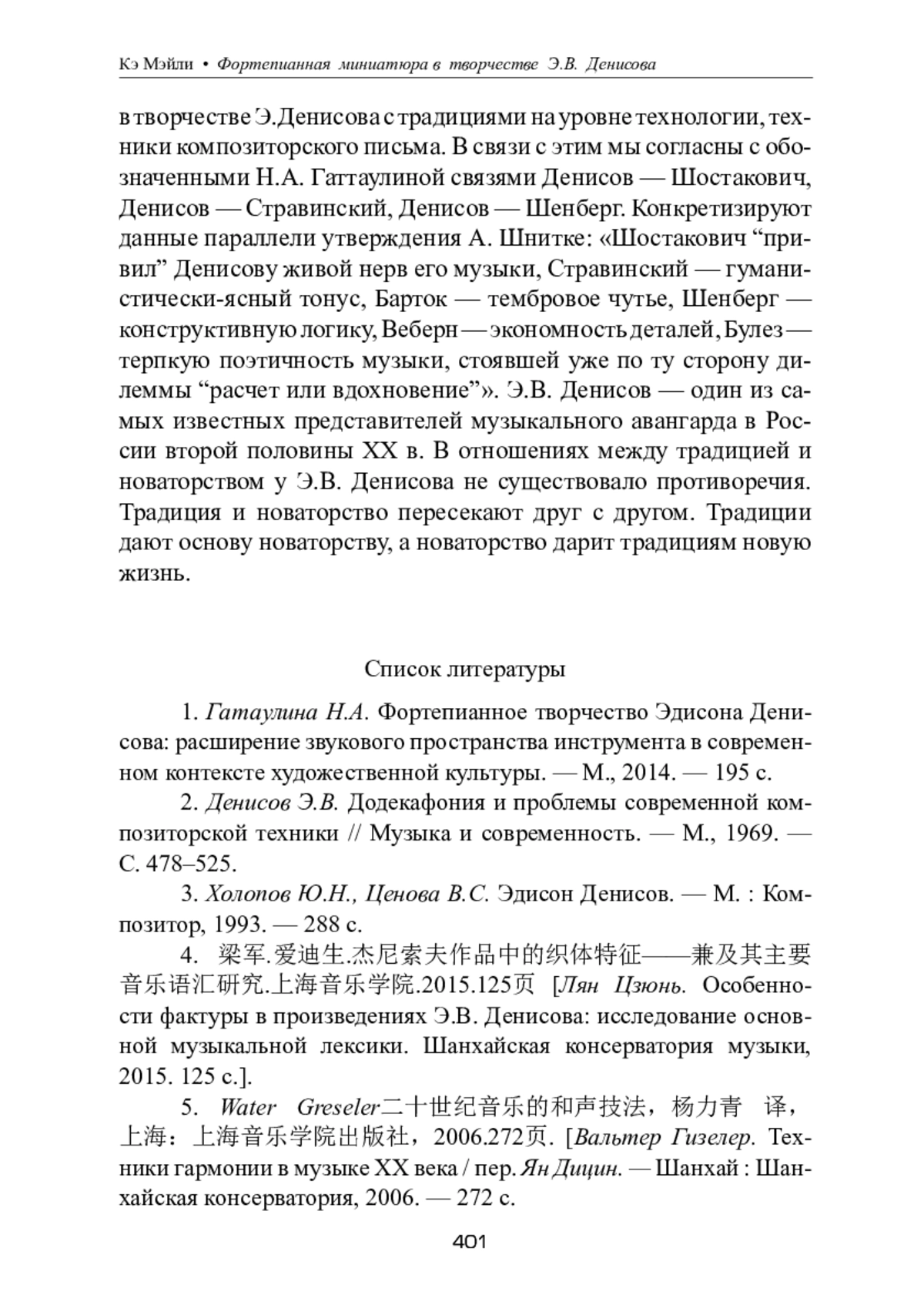 Лян Цзюнь. Особенности фактуры в произведениях Э.В. Денисова: исследование основной музыкальной лексики. Шанхайская консерватория музыки, 2015. 125 с.