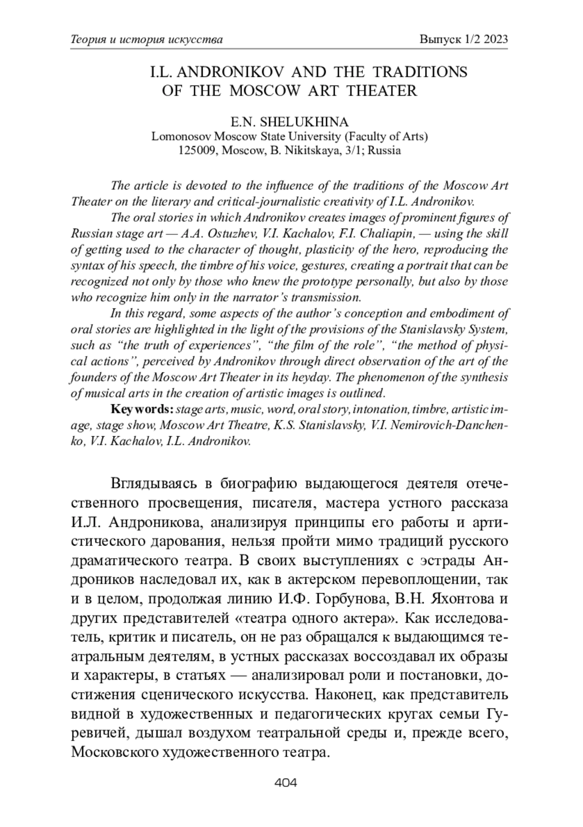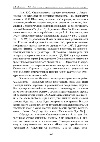 Статья посвящена влиянию традиций Московского художественного театра на литературное и критико-публицистическое творчество И. Л. Андроникова. Рассмотрены устные рассказы, в которых Андроников создает образы видных деятелей русского сценического искусства — А. А. Остужева, В. И. Качалова, Ф. И. Шаляпина, — пользуясь мастерством вживания в характер мысли, пластику героя, воспроизводя синтаксис его речи, тембр голоса, жесты, создавая портрет, который может быть узнан не только теми, кто знал прототипа лично, но и теми, кто представляет его через искусство рассказчика. В связи с этим освещены некоторые аспекты замысла и воплощения устных рассказов автора в свете положений системы К. С. Станиславского, таких как «правда переживаний», «кинолента роли», «метод физических действий», воспринятые Андрониковым через непосредственное наблюдение за искусством основателей МХАТа в годы его расцвета. Намечено явление синтеза мусических искусств в создании художественных образов