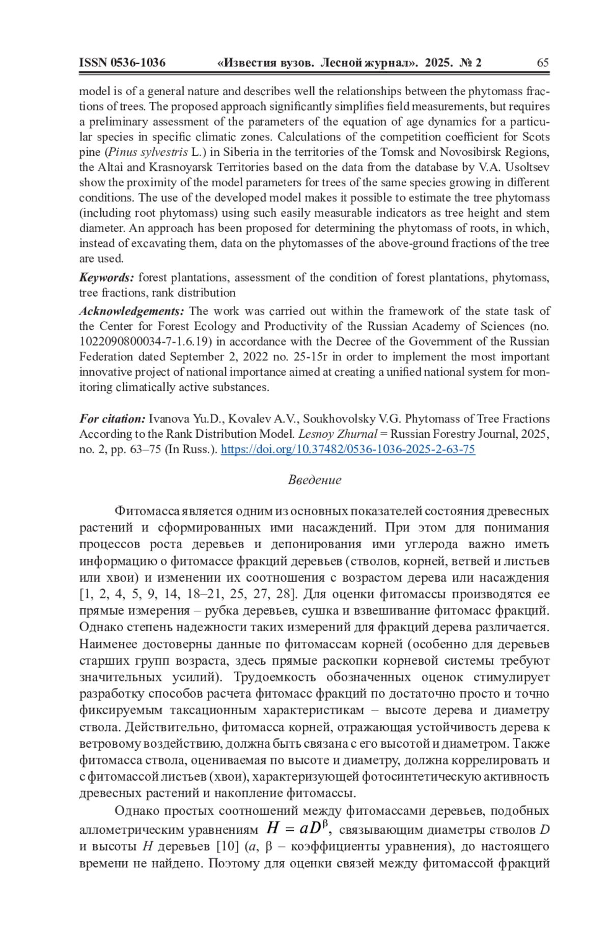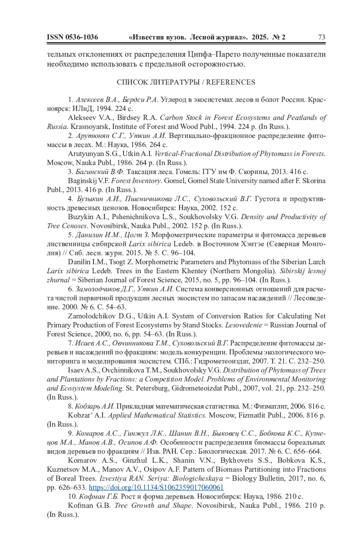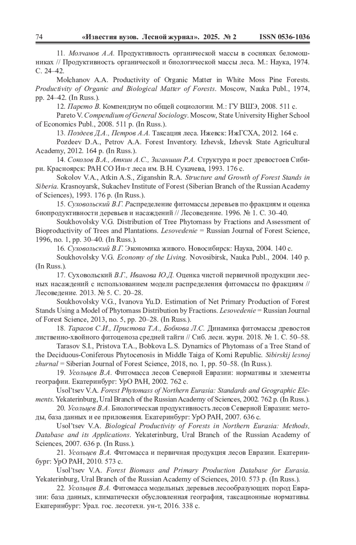 15. Суховольский В.Г. Распределение фитомассы деревьев по фракциям и оценка биопродуктивности деревьев и насаждений // Лесоведение. 1996. No 1. С. 30-40.