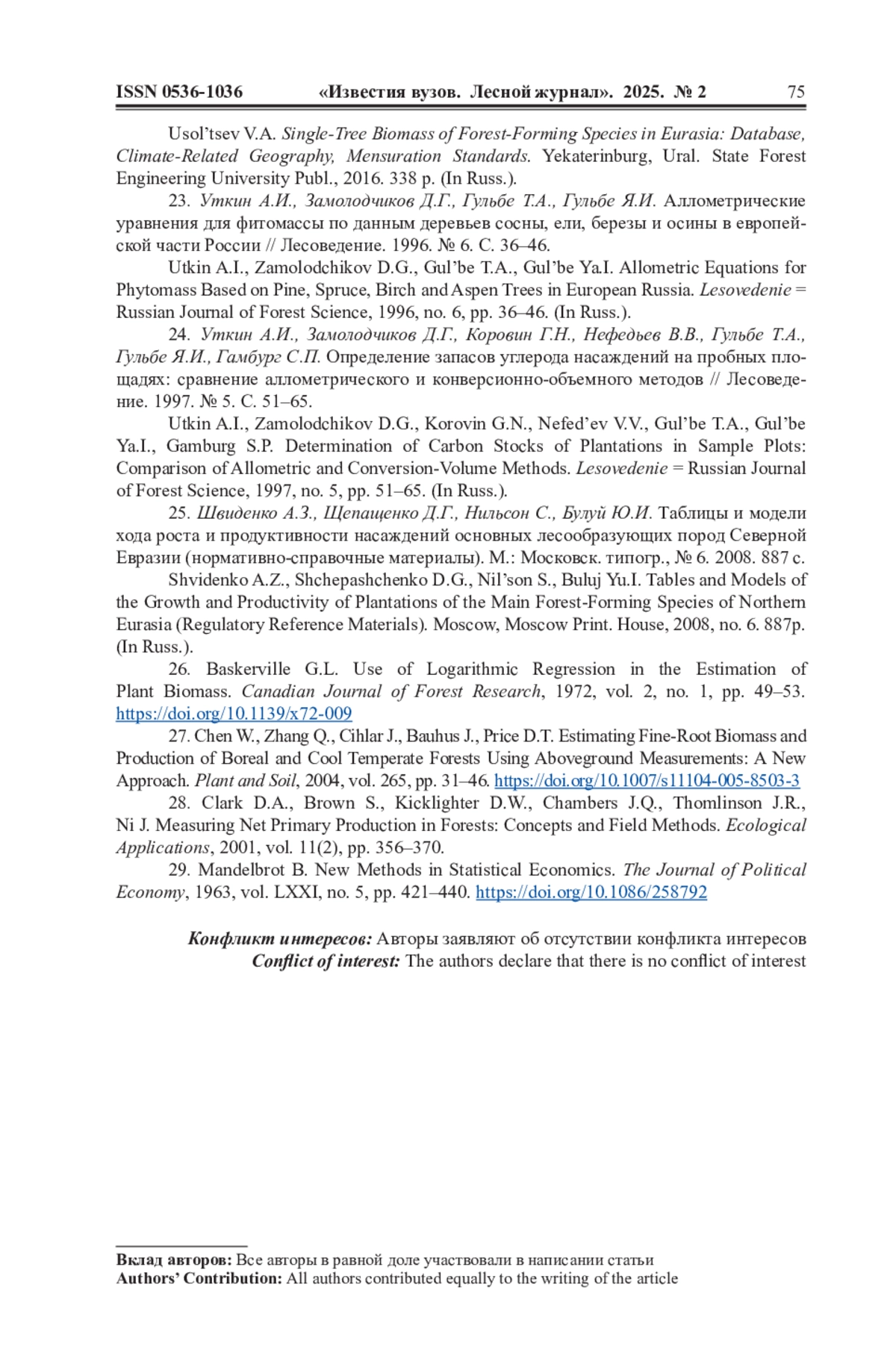 23. Уткин А.И., Замолодчиков Д.Г., Гульбе Т.А., Гульбе Я.И. Аллометрические уравнения для фитомассы по данным деревьев сосны, ели, березы и осины в европейской части России // Лесоведение. 1996. No 6. С. 36-46. EDN: RXKCRF