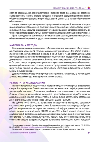 Обсуждение и заключение. В большей части научных работ тема молодежных объединений изучена с социологической или политологической стороны, что порождает потребность изучения молодежных общественных объединений с исторической точки зрения. Кроме того, значимую роль в изучении данной проблемы играют региональные исследования, благодаря которым складывается история молодежных объединений всей страны. Материалы статьи могут быть полезны для развития идей государственной и региональной молодежной политики.