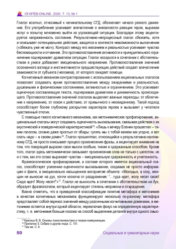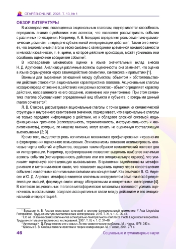Обсуждение и заключение. Сделанные автором выводы вносят вклад в развитие когнитивной лингвистики. Перспективы дальнейших исследований связаны с углубленным изучением специфики взаимодействия акциональных глаголов с другими когнитивными механизмами в текстах разных жанров. Материалы статьи могут быть полезны в преподавании русского языка и разработке методов функционально-семантического анализа