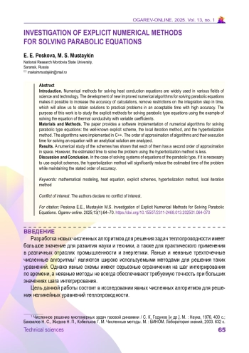 Введение. Численные методы решения уравнений теплопроводности широко применяются в различных областях науки и техники. Разработка новых улучшенных численных алгоритмов для решения уравнений параболического типа позволяет повысить точность расчетов, снять ограничения на шаг интегрирования по времени, что позволит решать практические задачи за приемлемое время с высокой точностью. Цель исследования – изучить явные методы решения уравнений параболического типа на примере решения уравнения теплопроводности с переменными коэффициентами.