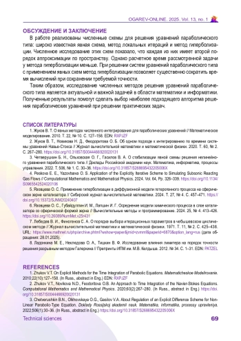 Обсуждение и заключение. В случае решения систем уравнений параболического типа, когда требуется использование явных схем, метод гиперболизации даст значительное сокращение расчетного времени задачи при сохранении заявленного порядка аппроксимации. Материалы исследования могут быть полезны при выборе оптимального метода решения параболических уравнений для выполнения практических задач.