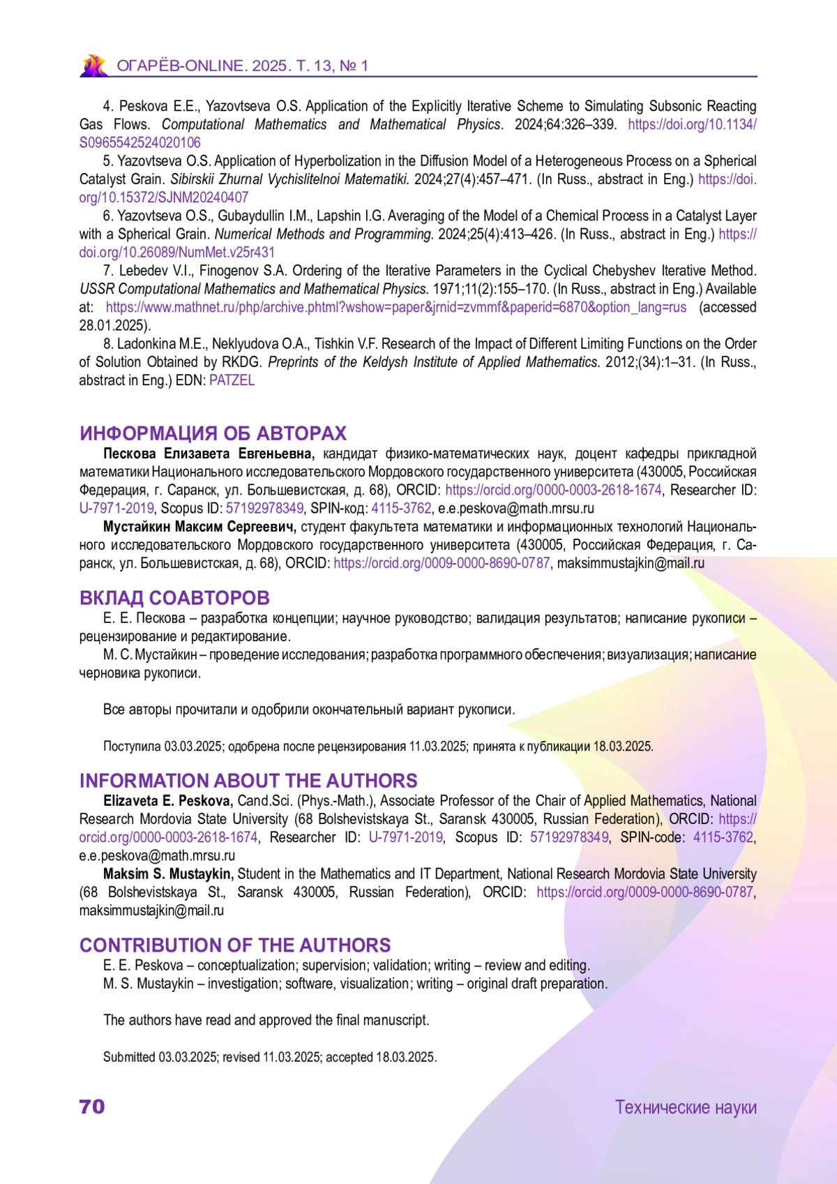 6. Язовцева О. С., Губайдуллин И. М., Лапшин И. Г. Осреднение модели химического процесса в слое катализатора со сферической формой зерна // Вычислительные методы и программирование. 2024. 25, № 4. 413-426. DOI: 10.26089/NumMet.v25r431