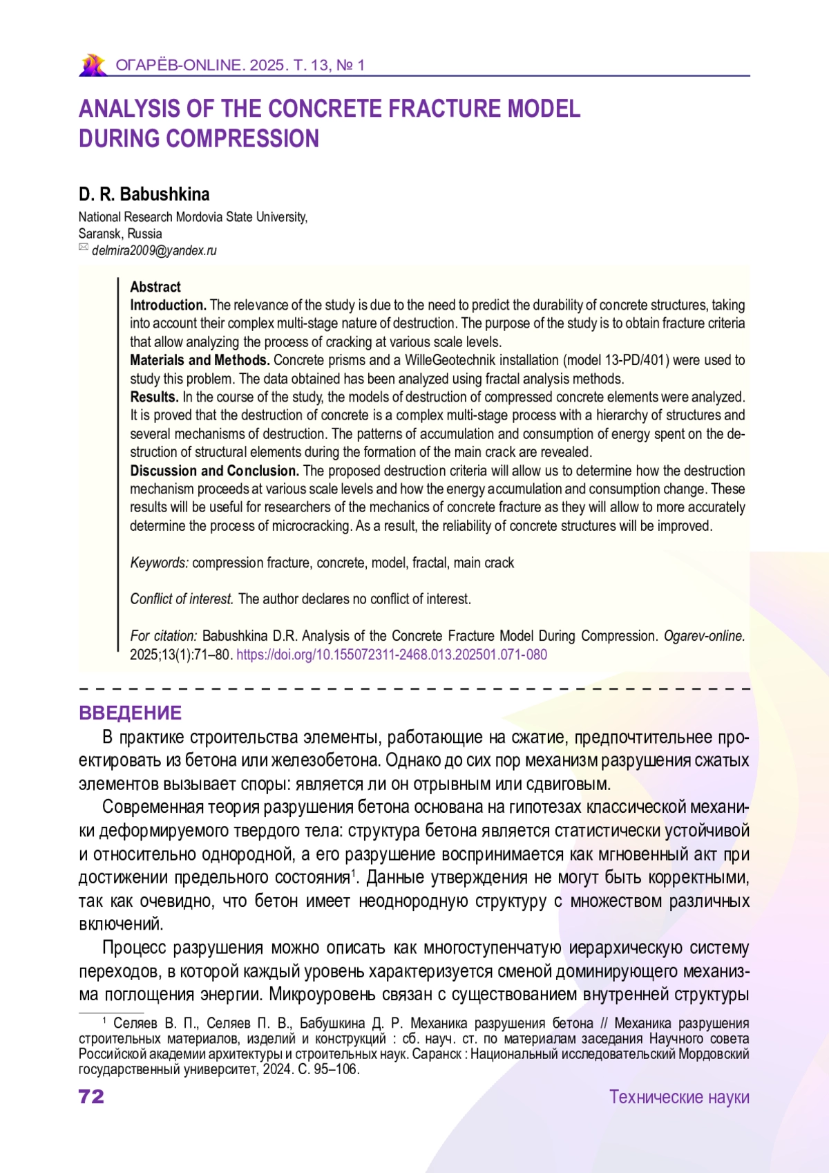Результаты исследования. В ходе исследования проведен анализ моделей разрушения сжатых бетонных элементов. Доказано, что разрушение бетона – сложный многоступенчатый процесс, имеющий иерархию структур и включающий несколько механизмов разрушения. Выявлены закономерности накопления и расхода энергии, затрачиваемой на разрушение структурных элементов в процессе образования магистральной трещины.