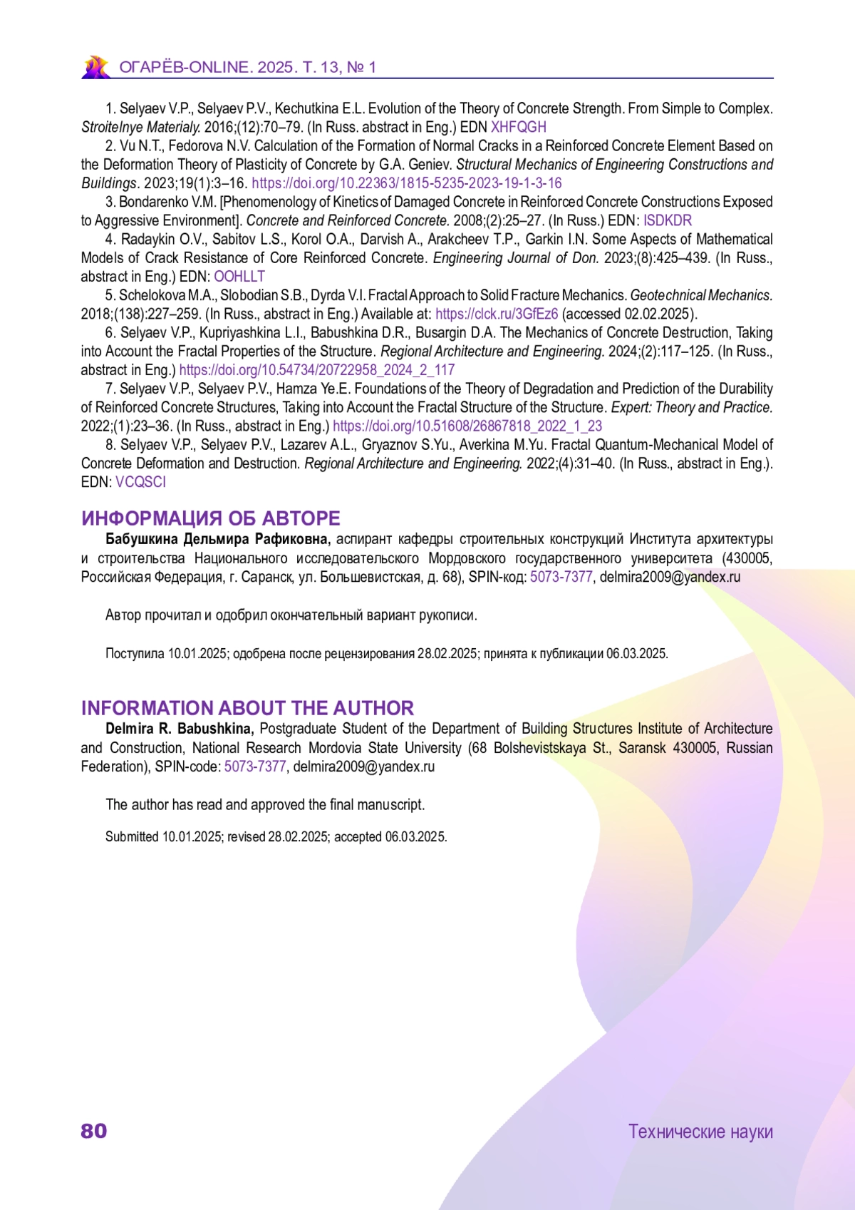 8. Фрактальная квантово-механическая модель деформирования и разрушения бетона / В. П. Селяев [и др.] // Региональная архитектура и строительство. 2022. № 4. С. 31-40.