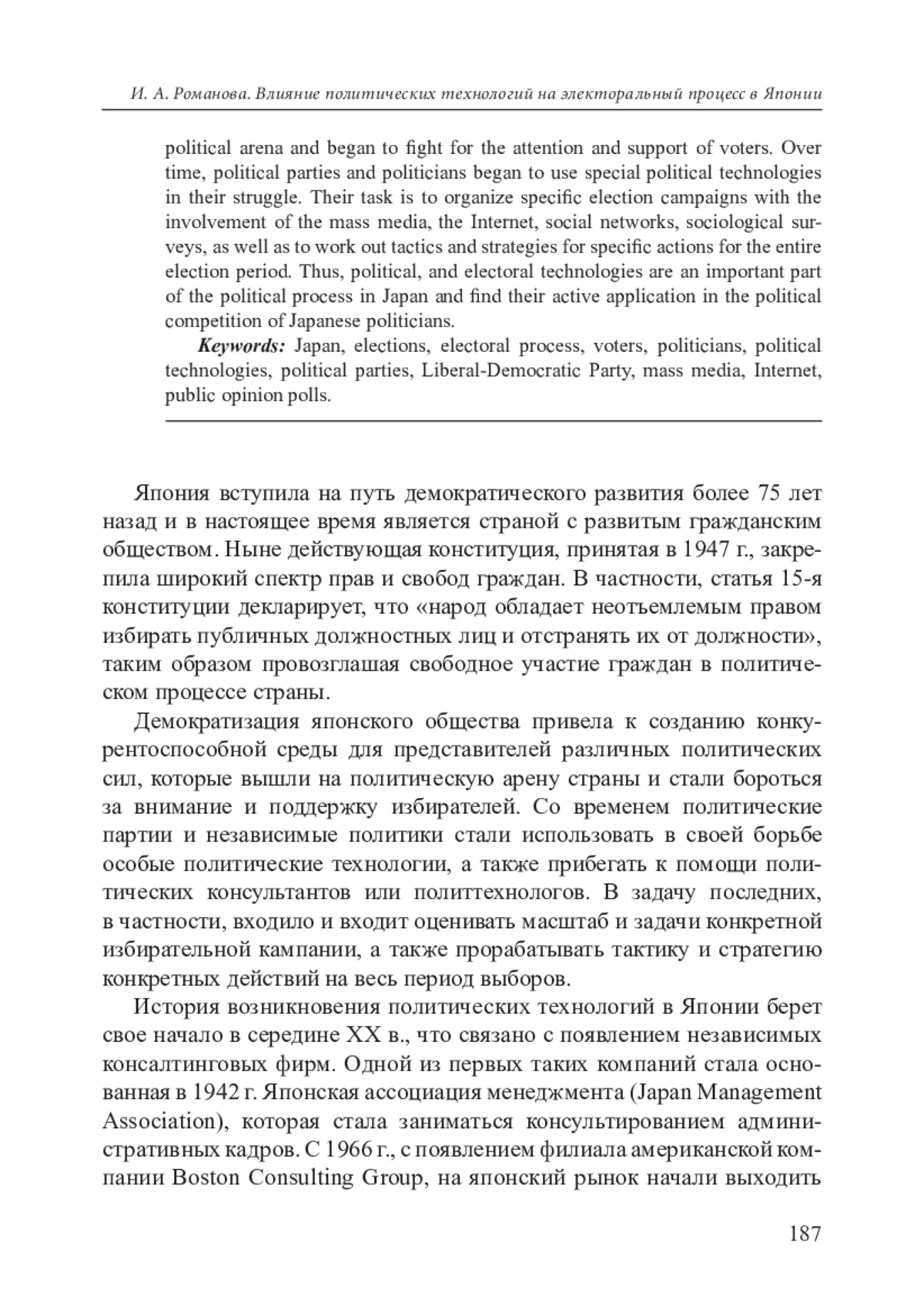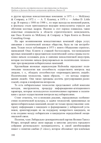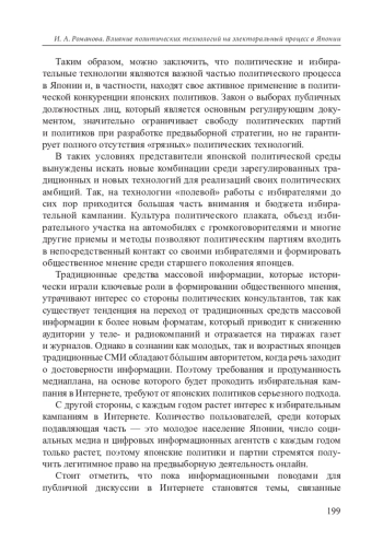 РОМАНОВА И. А. ВЛИЯНИЕ ПОЛИТИЧЕСКИХ ТЕХНОЛОГИЙ НА ЭЛЕКТОРАЛЬНЫЙ ПРОЦЕСС В ЯПОНИИ // НЕСТАБИЛЬНОСТЬ ГЕОСТРАТЕГИЧЕСКОГО ПРОСТРАНСТВА НА БЛИЖНЕМ, СРЕДНЕМ И ДАЛЬНЕМ ВОСТОКЕ: АКТУАЛЬНЫЕ ПРОБЛЕМЫ. 2022. № 9