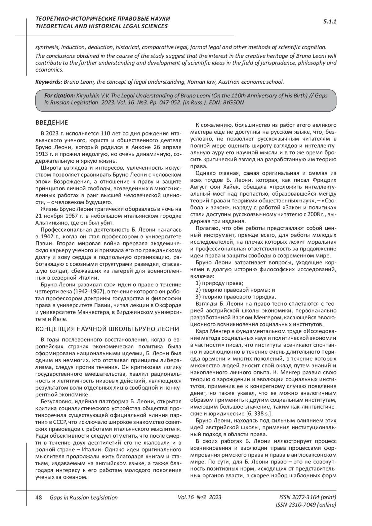 Актуальность темы исследования. Ввиду смены идеологической парадигмы в постсоветский период вопросы методологии теории и истории права обрели новое звучание, вовлекая исследователей в многочисленные дискуссии. В то же время, правовой позитивизм, признавая в качестве правовых только нормы позитивного права, напрямую увязывая последнее с институтом государства, до сих пор доминирует в отечественной юридической науке. Приходится констатировать, что позитивизм фактически игнорирует сложный фундамент под институтом права, который возникает словно из небытия. Методология изучения генезиса права за границами позитивистской парадигмы в отечественном правоведении является не самым сильным козырем. В силу этого автор обращает читателя к творчеству итальянского философа, антифашиста, ученого, юриста Бруно Леони (1913-1967), оказавшего значительное влияние на развитие философских и юридических взглядов XX столетия. Основывая и развивая свою концепцию правопонимания на постулатах римского права, взглядах представителей различных поколений австрийской школы экономической теории, Бруно Леони осуществил одну из самых обоснованных и удачных попыток противостоять доминированию в европейской правовой мысли нормативизма Г. Кельзена. Цель написания исследовательской работы заключается в авторском осмыслении творческого наследия Бруно Леони, определении места его научных идей в юридическом мировоззрении XX века, обращении внимания на продуктивные основы его методологии в изучении права. Основным методом, используемым при написании работы, является диалектический метод познания окружающей действительности. Кроме того, при написании работы автором использовался ряд общих и специальных методов научного познания: анализ, синтез, индукция, дедукция, исторический, сравнительно-правовой, формально-юридические и другие методы научного познания. Выводы, полученные в ходе исследования, позволяют утверждать, что интерес к творческому наследию Бруно Леони будет способствовать дальнейшему осмыслению и развитию научных идей в области юриспруденции, философии и экономики.