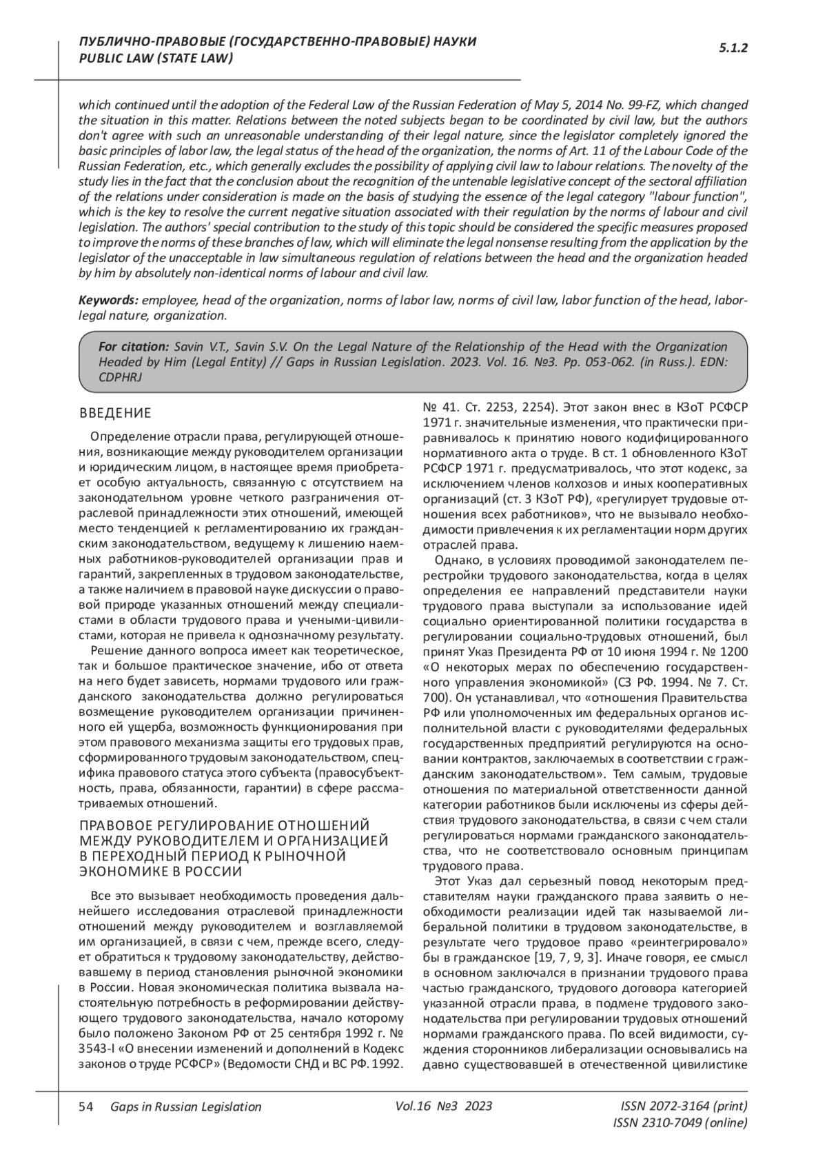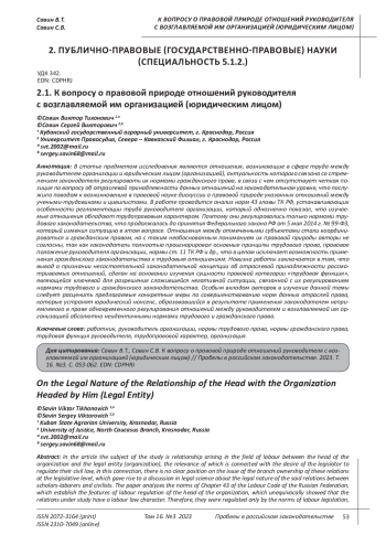 В статье предметом исследования являются отношения, возникающие в сфере труда между руководителем организации и юридическим лицом (организацией), актуальность которого связана со стремлением законодателя регулировать их нормами гражданского права, в связи с чем отсутствует четкая позиция по вопросу об отраслевой принадлежности данных отношений на законодательном уровне, что послужило поводом к возникновению в правовой науке дискуссии о правовой природе указанных отношений между учеными-трудовиками и цивилистами. В работе проводится анализ норм 43 главы ТК РФ, устанавливающих особенности регламентации труда руководителя организации, который однозначно показал, что изучаемые отношения обладают трудоправовым характером. Поэтому они регулировались только нормами трудового законодательства, что продолжалось до принятия Федерального закона РФ от 5 мая 2014 г. № 99-ФЗ, который изменил ситуацию в этом вопросе. Отношения между отмеченными субъектами стали координироваться и гражданским правом, но с таким необоснованным пониманием их правовой природы авторы не согласны, так как законодатель полностью проигнорировал основные принципы трудового права, правовое положение руководителя организации, нормы ст. 11 ТК РФ и др., что в целом исключает возможность применения гражданского законодательства к трудовым отношениям. Новизна работы заключается в том, что вывод о признании несостоятельной законодательной концепции об отраслевой принадлежности рассматриваемых отношений, сделан на основании изучения сущности правовой категории «трудовая функция», являющейся ключевой для разрешения сложившейся негативной ситуации, связанной с их регулированием нормами трудового и гражданского законодательства. Особым вкладом авторов в изучение данной темы следует расценить предлагаемые конкретные меры по совершенствованию норм данных отраслей права, которые устранят юридический нонсенс, образовавшийся в результате применения законодателем неприемлемого в праве одновременного регулирования отношений между руководителем и возглавляемой им организацией абсолютно неидентичными нормами трудового и гражданского права.