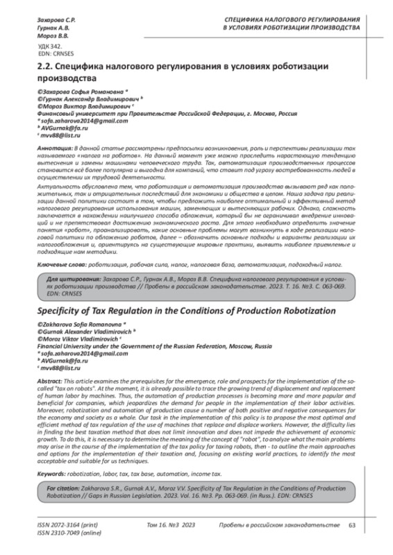В данной статье рассмотрены предпосылки возникновения, роль и перспективы реализации так называемого «налога на роботов». На данный момент уже можно проследить нарастающую тенденцию вытеснения и замены машинами человеческого труда. Так, автоматизация производственных процессов становится всё более популярна и выгодна для компаний, что ставит под угрозу востребованность людей в осуществлении их трудовой деятельности. Актуальность обусловлена тем, что роботизация и автоматизация производства вызывают ряд как положительных, так и отрицательных последствий для экономики и общества в целом. Наша задача при реализации данной политики состоит в том, чтобы предложить наиболее оптимальный и эффективный метод налогового регулирования использования машин, заменяющих и вытесняющих рабочих. Однако, сложность заключается в нахождении наилучшего способа обложения, который бы не ограничивал внедрение инноваций и не препятствовал достижению экономического роста. Для этого необходимо определить значение понятия «робот», проанализировать, какие основные проблемы могут возникнуть в ходе реализации налоговой политики по обложению роботов, далее - обозначить основные подходы и варианты реализации их налогообложения и, ориентируясь на существующие мировые практики, выявить наиболее приемлемые и подходящие нам методики.