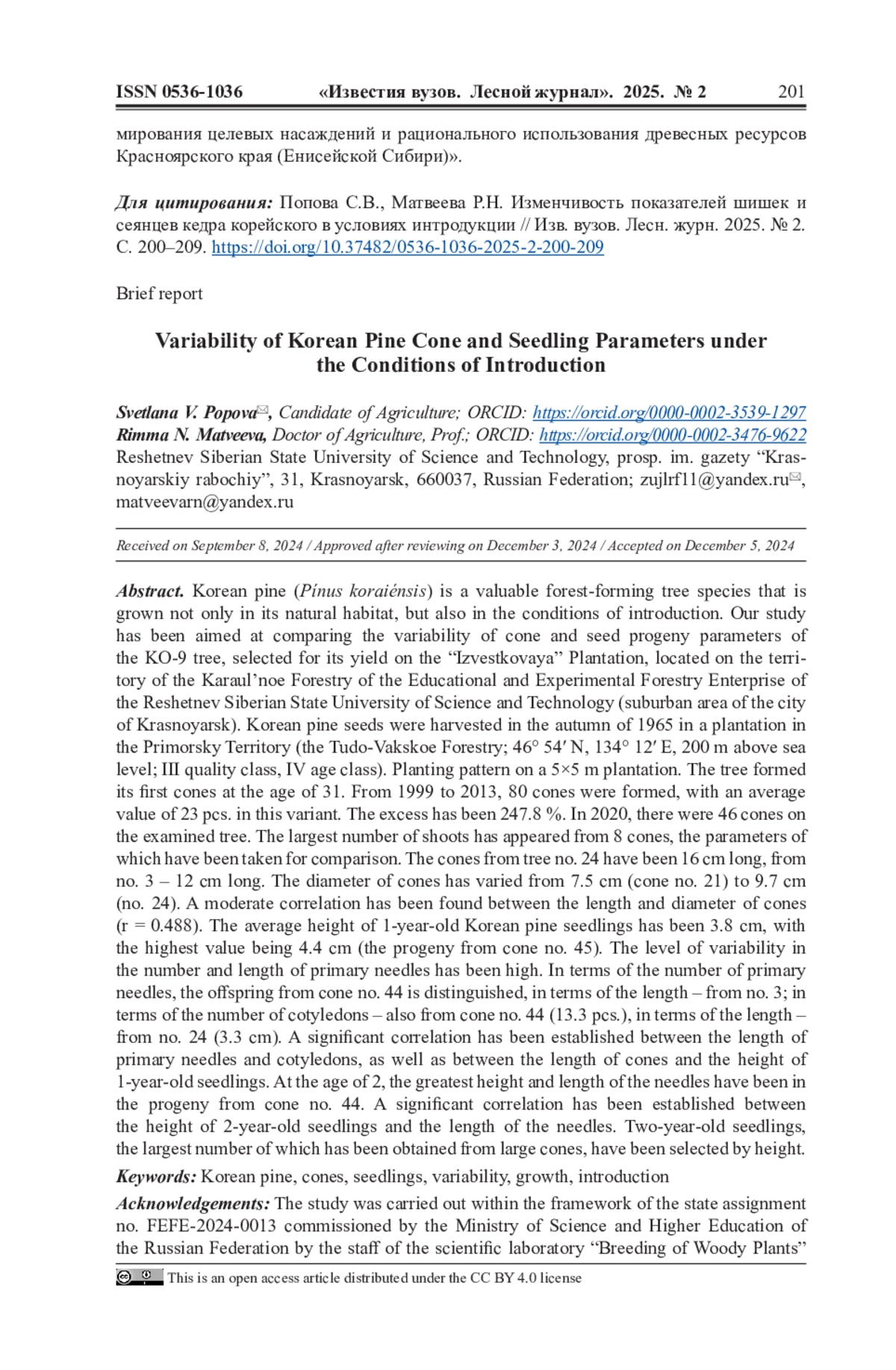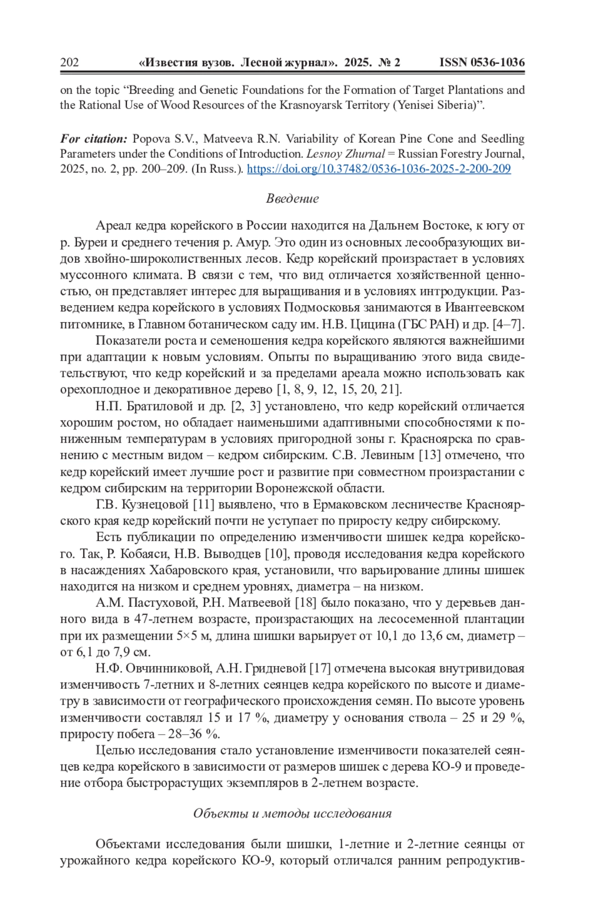 15. Матвеева Р.Н., Братилова Н.П., Буторова О.Ф. Изменчивость показателей роста и генеративного развития кедровых сосен на плантации зеленой зоны города Красноярска // Сиб. лесн. журн. 2014. No 2. С. 81-86. EDN: SMHFWZ