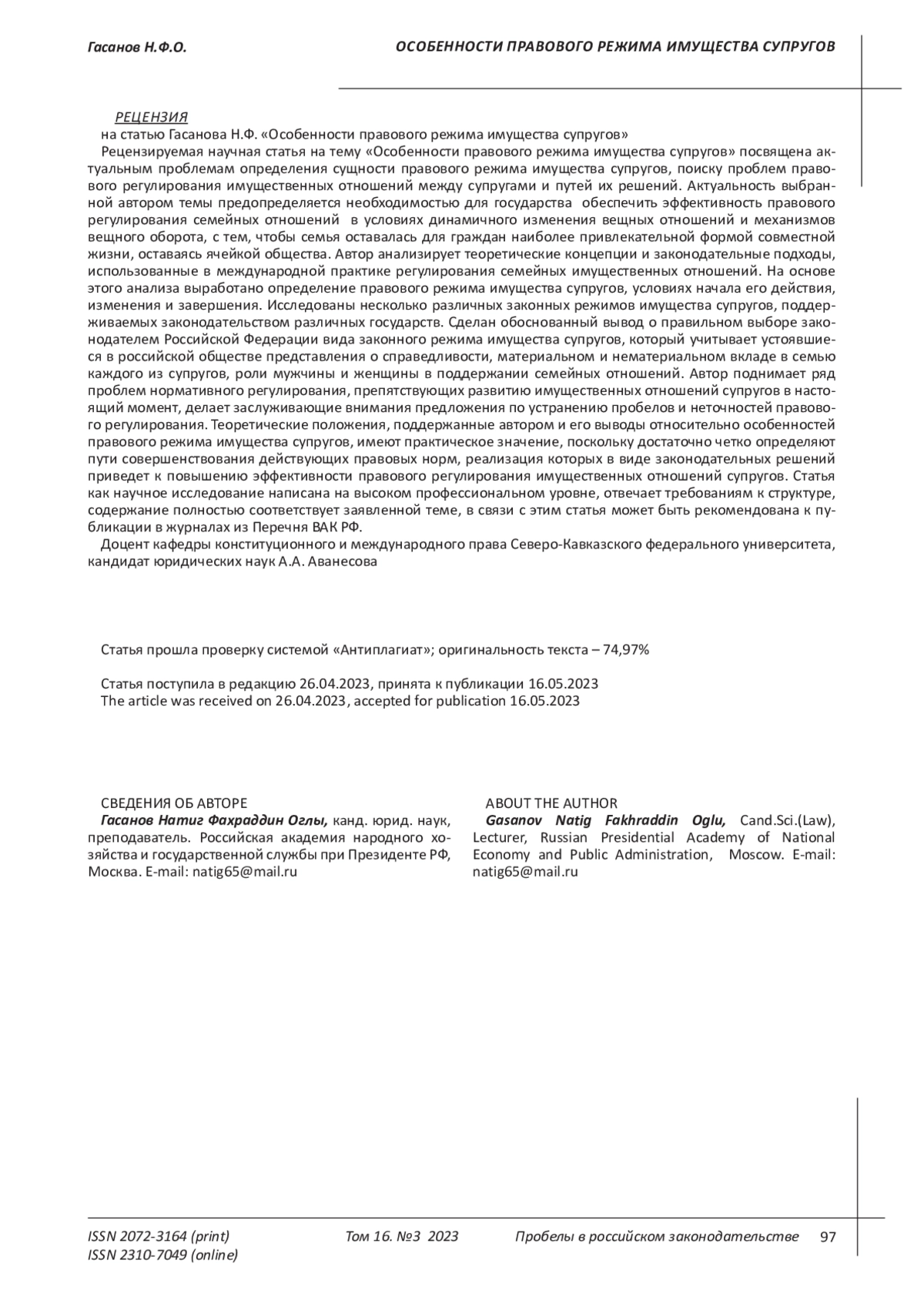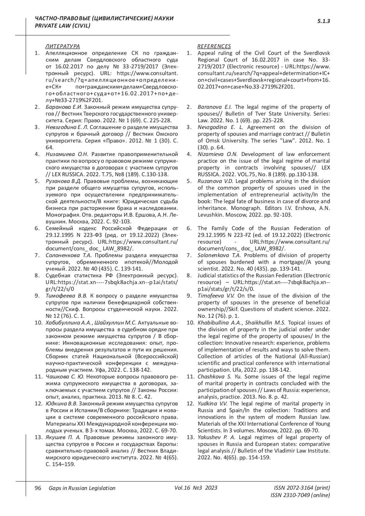 4. Низамиева О.Н. Развитие правоприменительной практики по вопросу о правовом режиме супружеского имущества в договорах с участием супругов // LEX RUSSICA. 2022. Т.75, №8 (189). С.130-138. EDN: DXHLBP