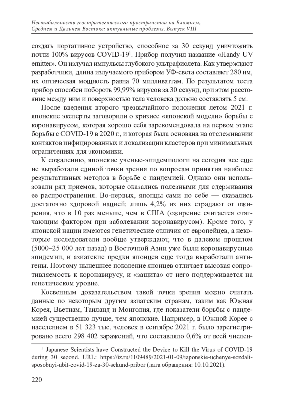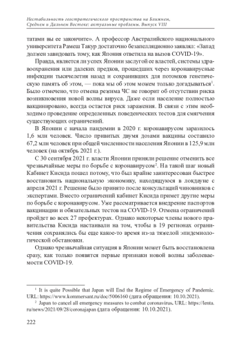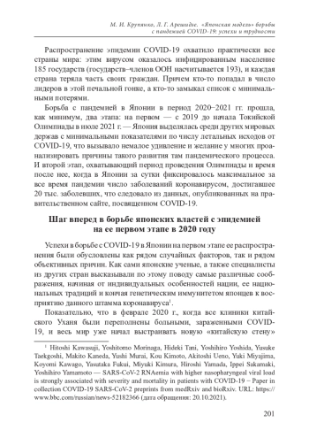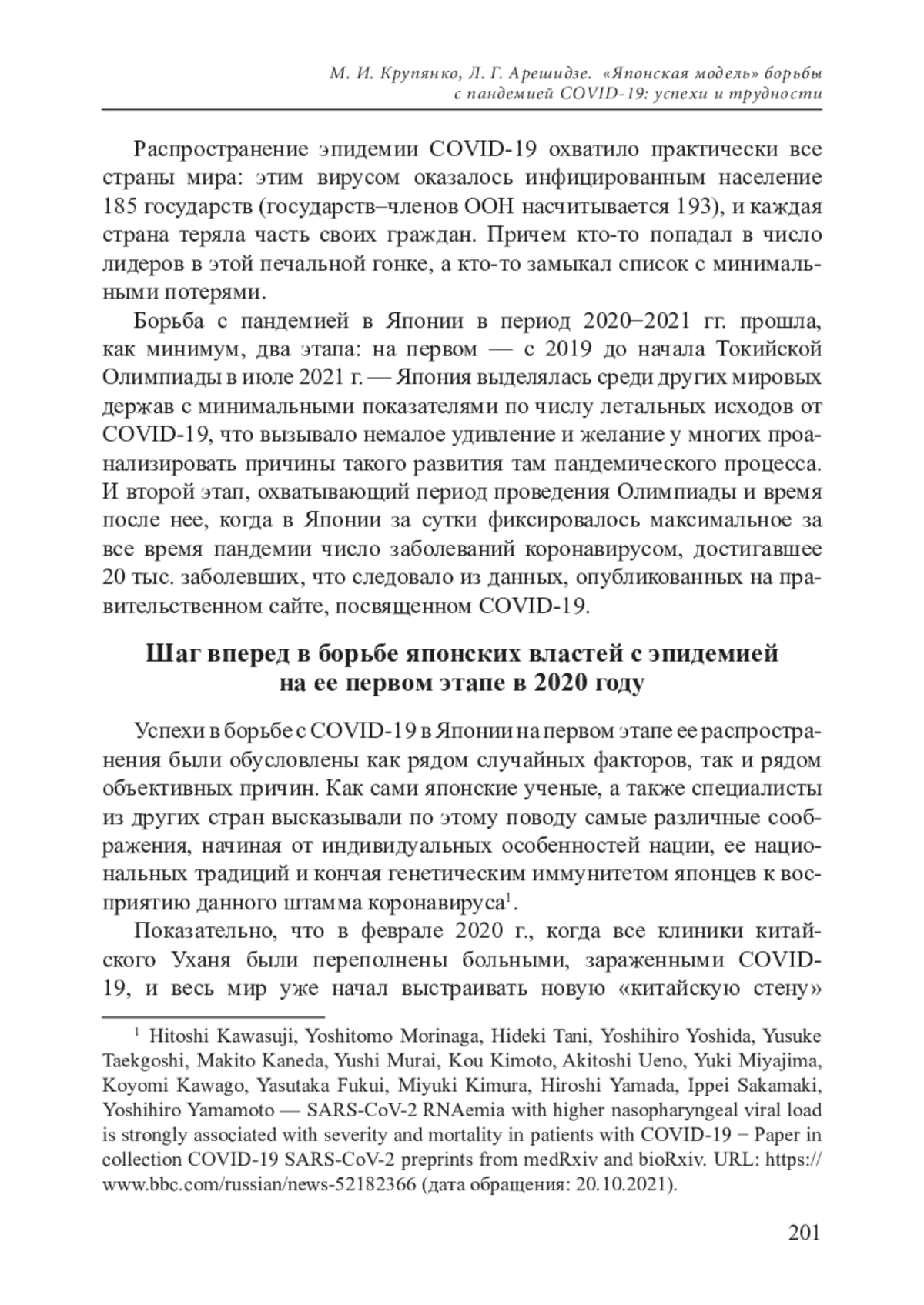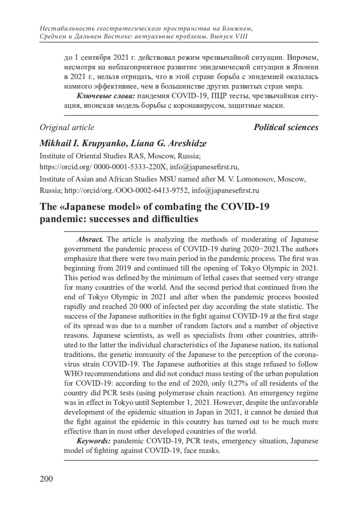 КРУПЯНКО М. И., АРЕШИДЗЕ Л. Г. «ЯПОНСКАЯ МОДЕЛЬ» БОРЬБЫ С ПАНДЕМИЕЙ COVID-19: УСПЕХИ И ТРУДНОСТИ // НЕСТАБИЛЬНОСТЬ ГЕОСТРАТЕГИЧЕСКОГО ПРОСТРАНСТВА НА БЛИЖНЕМ, СРЕДНЕМ И ДАЛЬНЕМ ВОСТОКЕ: АКТУАЛЬНЫЕ ПРОБЛЕМЫ. 2022. № 8