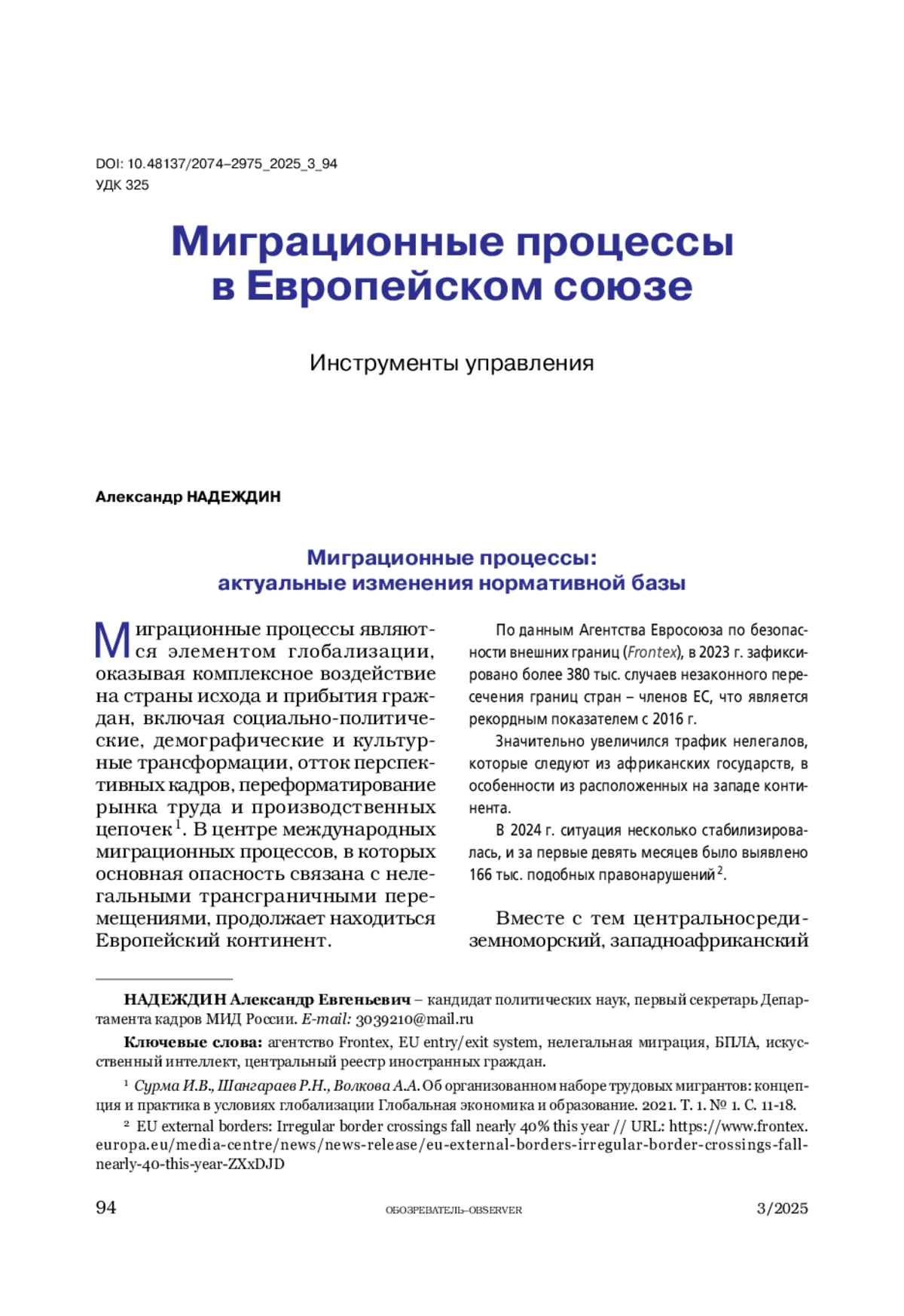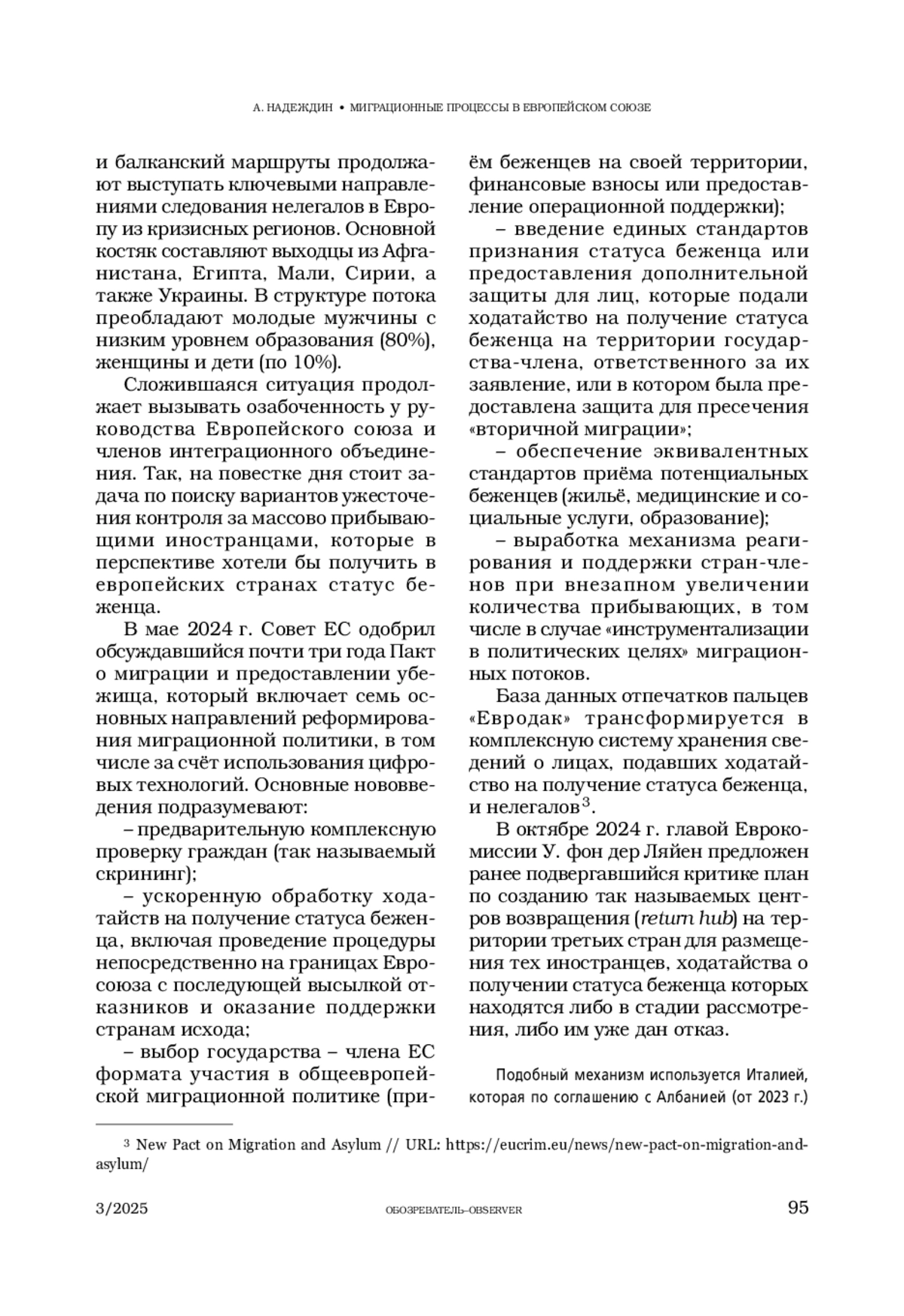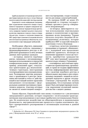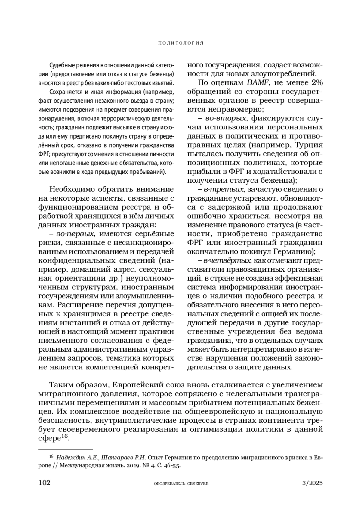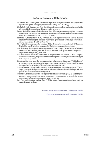 1. Надеждин А.Е., Шангараев Р.Н. Опыт Германии по преодолению миграционного кризиса в Европе Международная жизнь. 2019. № 4. С. 46-55. [Nadezhdin A.E., Shangarajev R.N. Opit Germanii po preodoleniju migracionnogo krizisa v Evrope Mezhdunarodnaja zhizn. 2019. № 4. S. 46-55]