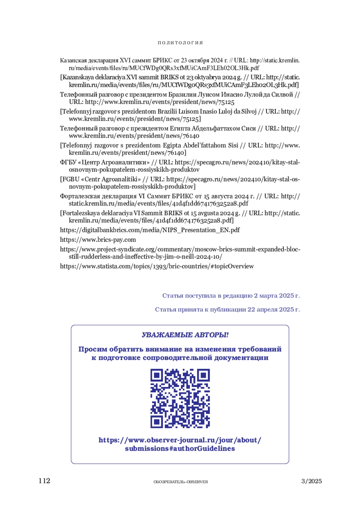 6. Форталезская декларация VI Саммит БРИКС от 15 августа 2024 г. // URL: http://static.kremlin.ru/media/events/files/41d4f1dd6741763252a8.pdf [Fortalezskaya deklaraciya VI Sammit BRIKS ot 15 avgusta 2024 g. // URL: http://static.kremlin.ru/media/events/files/41d4f1dd6741763252a8.pdf]