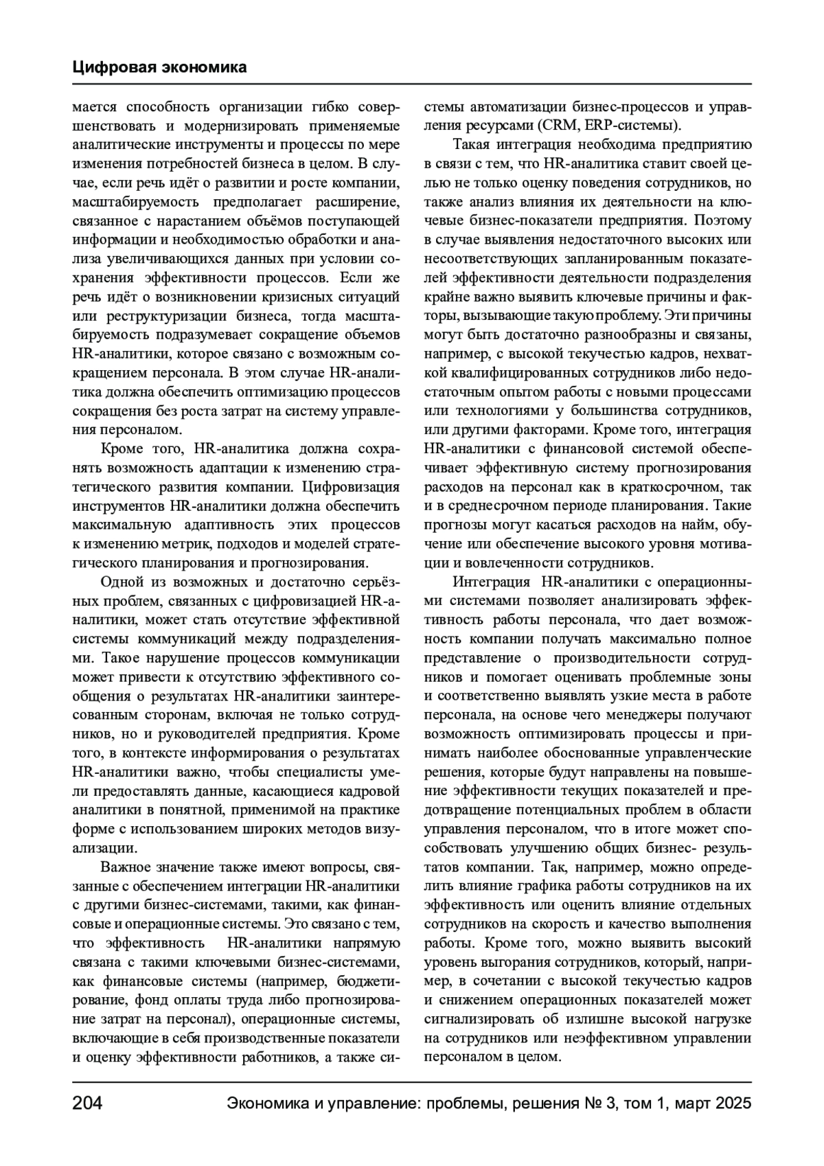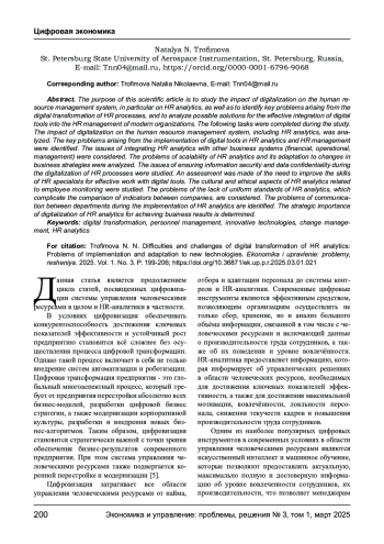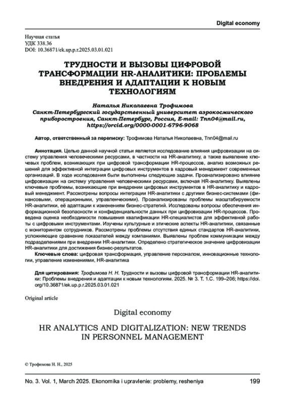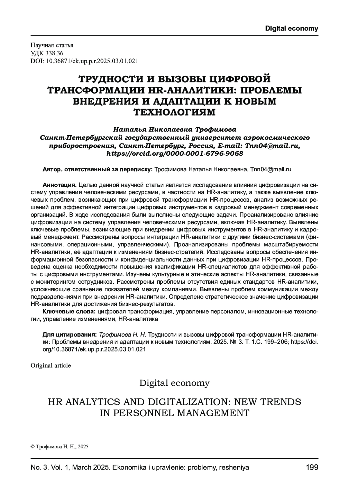 ТРОФИМОВА Н. Н. ТРУДНОСТИ И ВЫЗОВЫ ЦИФРОВОЙ ТРАНСФОРМАЦИИ HR-АНАЛИТИКИ: ПРОБЛЕМЫ ВНЕДРЕНИЯ И АДАПТАЦИИ К НОВЫМ ТЕХНОЛОГИЯМ // ЭКОНОМИКА И УПРАВЛЕНИЕ: ПРОБЛЕМЫ, РЕШЕНИЯ. 2025. ТОМ 1 № 3