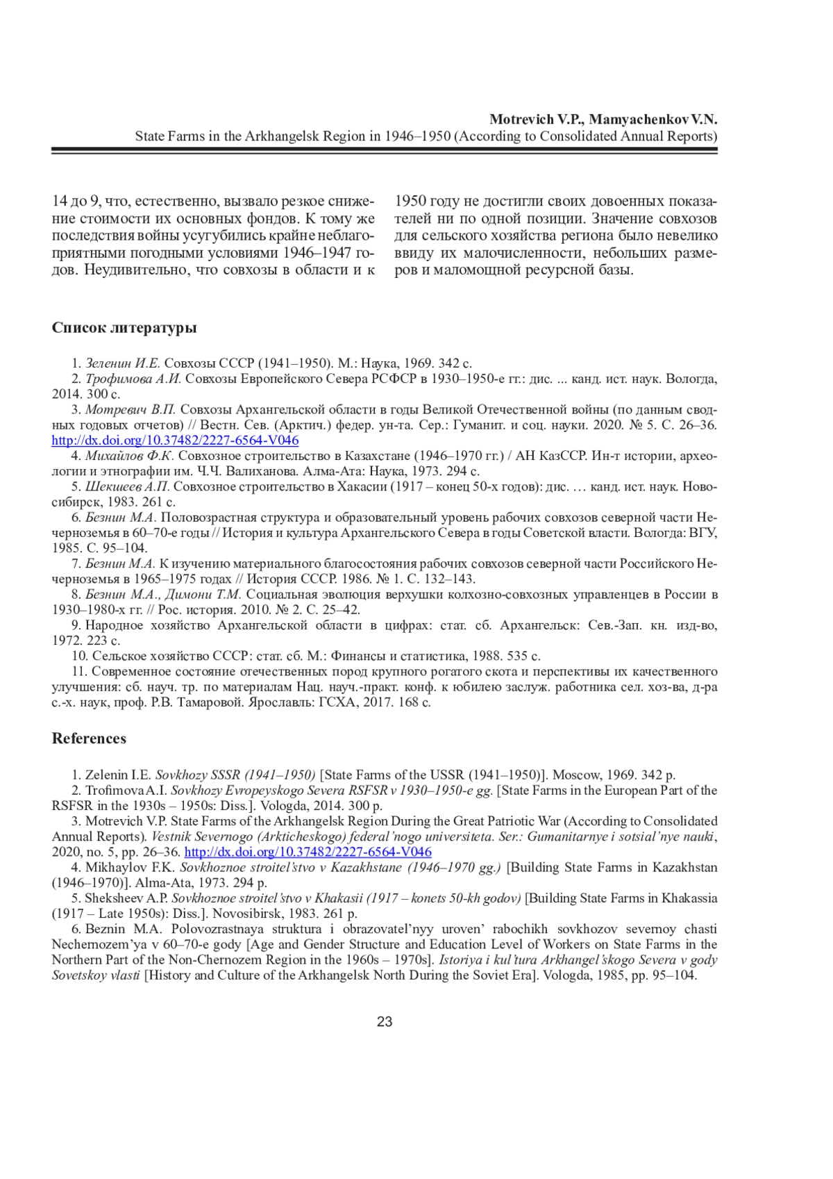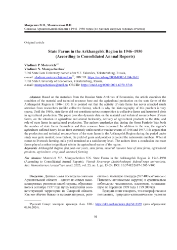 3. Мотревич, В. П. Совхозы Архангельской области в годы Великой Отечественной войны (по данным сводных годовых отчетов) / В. П. Мотревич // Вестник Северного (Арктического) федерального университета. Серия: Гуманитарные и социальные науки. - 2020. - № 5. - С. 26-36. DOI: 10.37482/2227-6564-V046 EDN: KSTUXC