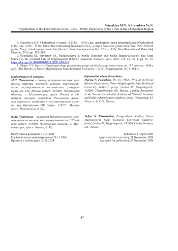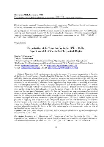 Статья: ОРГАНИЗАЦИЯ ПАССАЖИРСКИХ ПЕРЕВОЗОК НА ТРАМВАЯХ В 1930-1940-Е ГОДЫ: ОПЫТ ГОРОДОВ ЧЕЛЯБИНСКОЙ ОБЛАСТИ (2025)