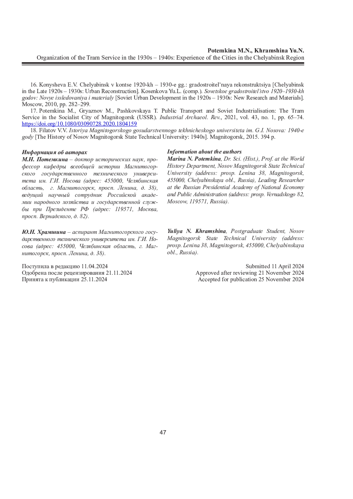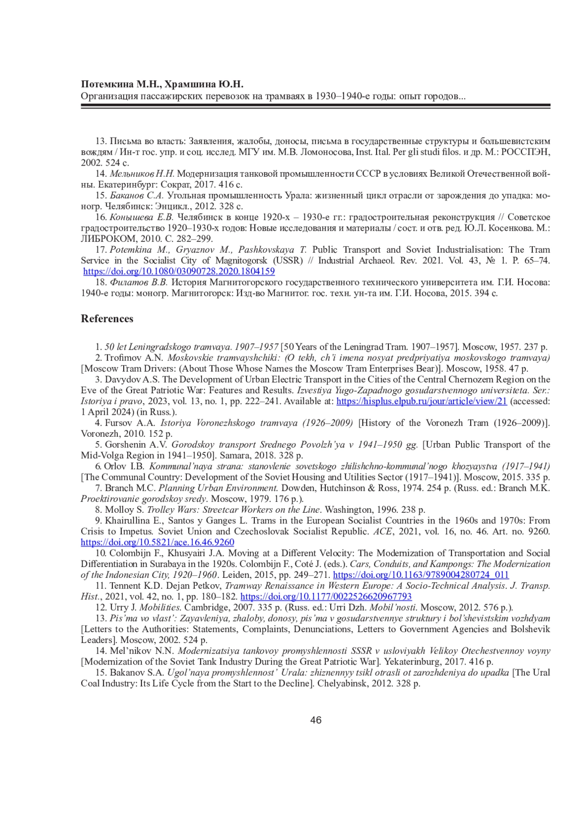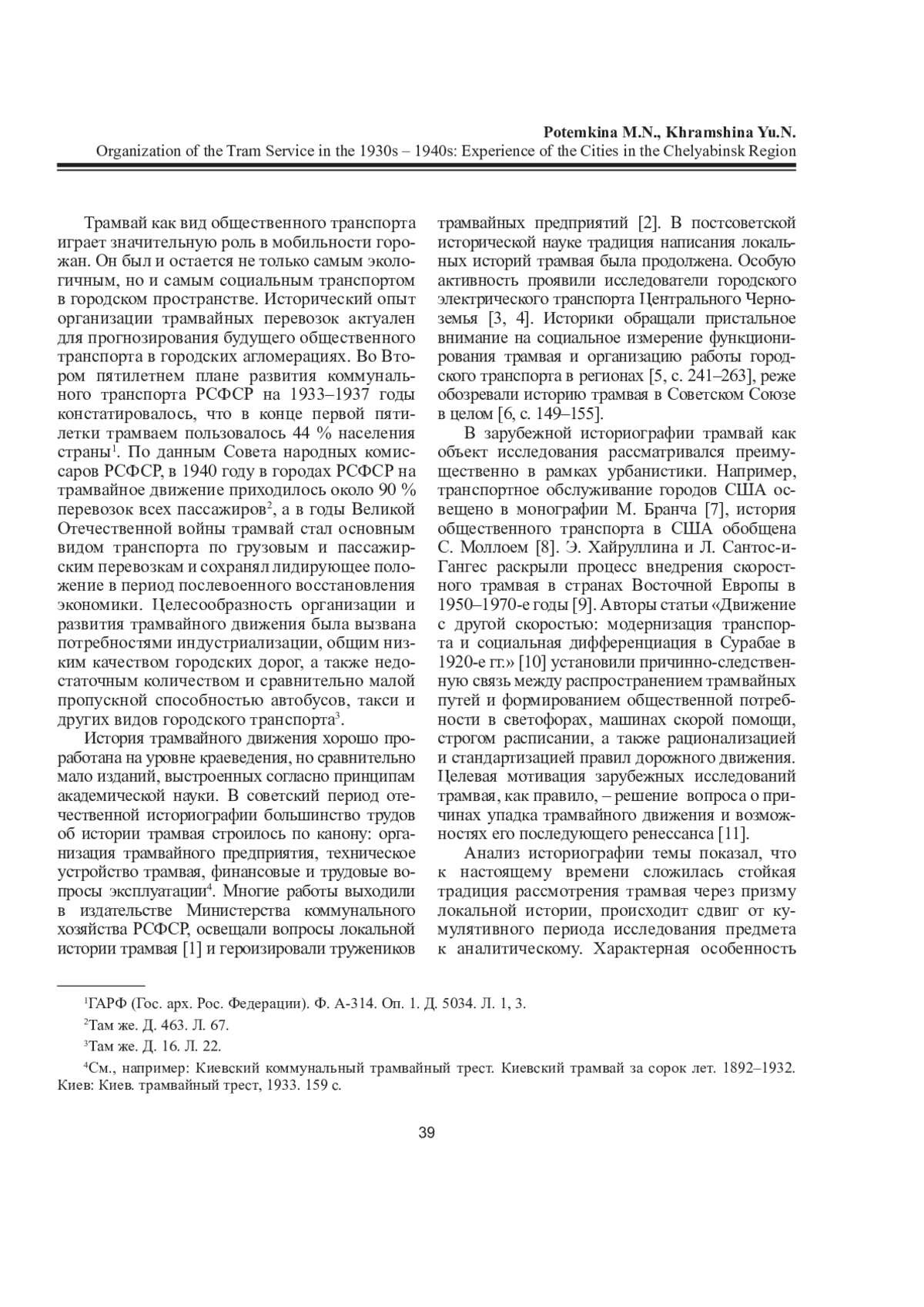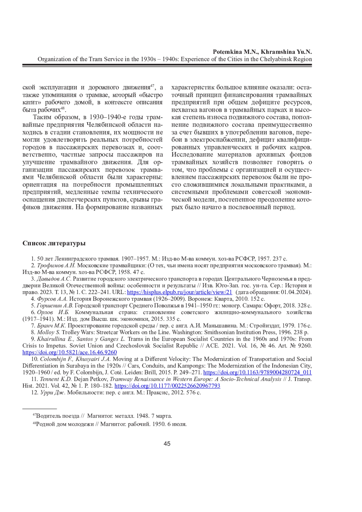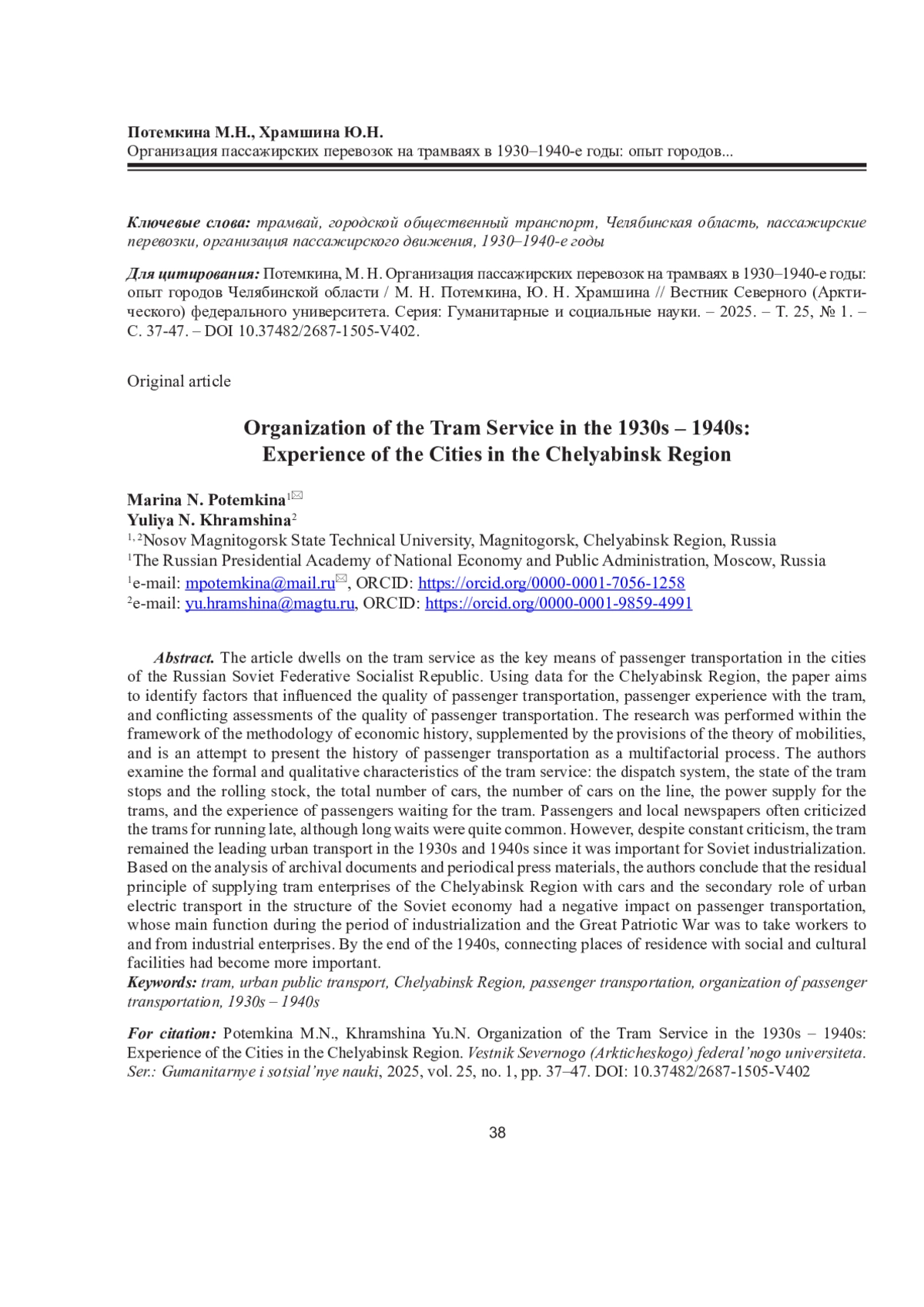 ПОТЕМКИНА М. Н., ХРАМШИНА Ю. Н. ОРГАНИЗАЦИЯ ПАССАЖИРСКИХ ПЕРЕВОЗОК НА ТРАМВАЯХ В 1930-1940-Е ГОДЫ: ОПЫТ ГОРОДОВ ЧЕЛЯБИНСКОЙ ОБЛАСТИ // ВЕСТНИК СЕВЕРНОГО (АРКТИЧЕСКОГО) ФЕДЕРАЛЬНОГО УНИВЕРСИТЕТА. СЕРИЯ: ГУМАНИТАРНЫЕ И СОЦИАЛЬНЫЕ НАУКИ. 2025. Т. 25 № 1