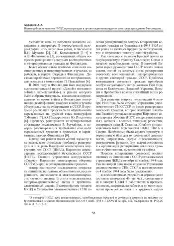 В статье на основе архивных документов, бóльшая часть которых вводится в научный оборот впервые, исследуется деятельность созданного в октябре 1944 года Управления уполномоченного Совета народных комиссаров СССР по делам репатриации советских граждан, объединившего ведомства, имевшие собственные зоны ответственности и вступавшие друг с другом в противоречия: Народный комиссариат внутренних дел, Народный комиссариат государственной безопасности и Главное управление контрразведки «Смерш» Народного комиссариата обороны. Материалы, касающиеся организации репатриации из Финляндии в СССР с 1944 по 1955 год, позволяют раскрыть процессы оперативного межведомственного взаимодействия, разработки соответствующих инструкций, ведомственного согласования в непредвиденных ситуациях. В конечном счете объединенные действия названных структур обеспечили успешную репатриацию не менее чем 100 тыс. советских граждан и военнопленных. В работе выделены аспекты, повлиявшие на ход репатриации, включая создание нормативно-правовой базы для разграничения межведомственных полномочий, выявление преступных элементов среди репатриантов, поиск сбежавших пленных. Постановления Государственного комитета обороны, нормативные документы Народного комиссариата внутренних дел, принятые и утвержденные в военное и послевоенное время, легли в основу процесса репатриации советских граждан, в т. ч. из Финляндии. В ходе исследования установлено, что часть советских граждан принимала участие в боевых действиях на стороне Финляндии в составе 3-го и 6-го батальонов. Некоторые военнопленные занимались контрразведывательной деятельностью, сотрудничали с администрацией лагерей. В статье обосновывается вывод, согласно которому межведомственное взаимодействие способствовало созданию устойчивой системы проверки репатриантов, обеспечению безопасности советских военнопленных и интернированных в период репатриации, распределению репатриантов для решения экономических задач советского государства.