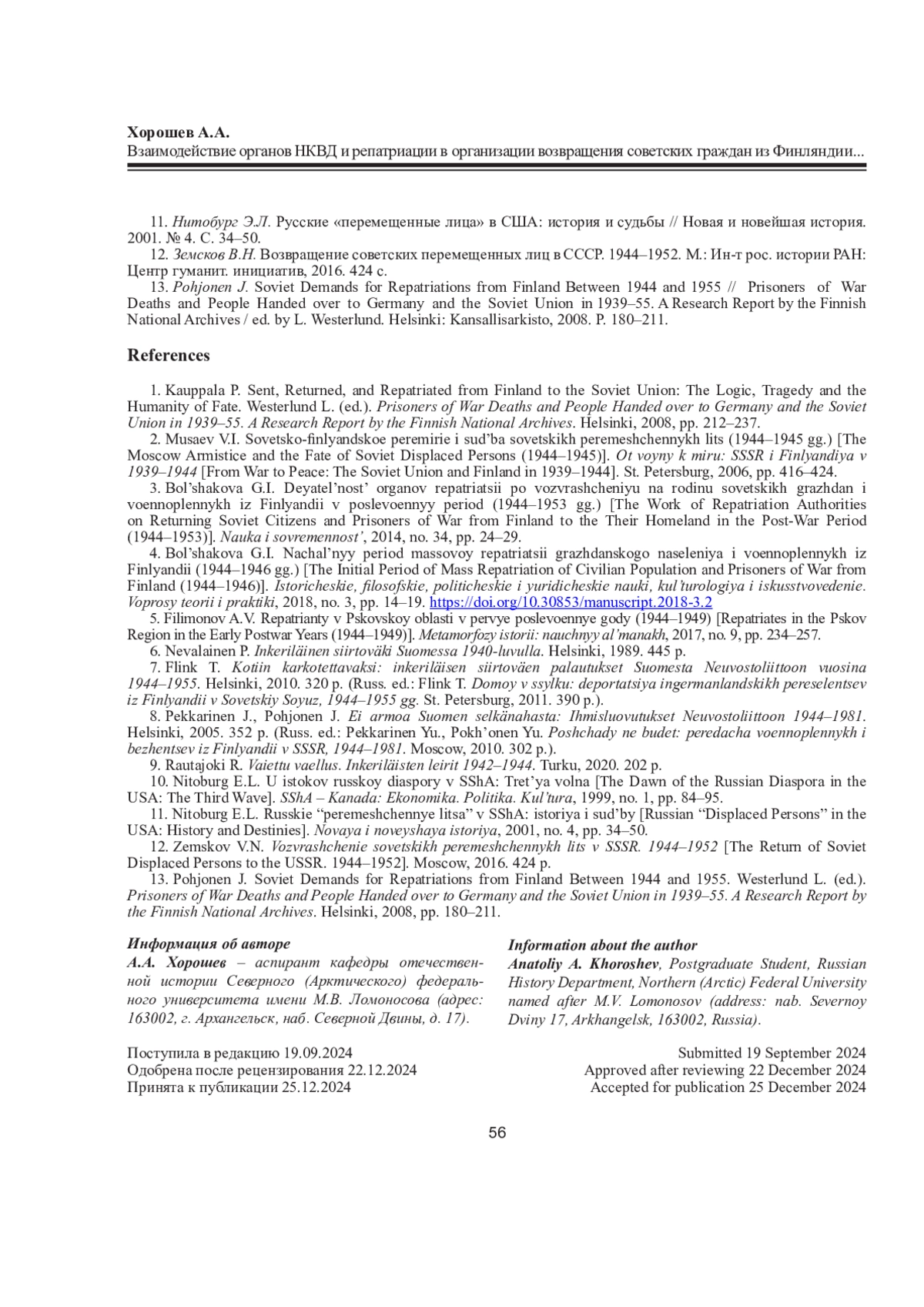 1. Kauppala P. Sent, Returned, and Repatriated from Finland to the Soviet Union: The Logic, Tragedy and the Humanity of Fate // Prisoners of War Deaths and People Handed over to Germany and the Soviet Union in 1939-55. A Research Report by the Finnish National Archives / ed. by L. Westerlund. Helsinki: Kansallisarkisto, 2008. P. 212-237.