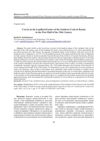 Исследование посвящено барщине в помещичьих имениях Южного Урала дореформенной России (в административно-территориальном делении первой половины XIX века - Оренбургской губернии). Показано, что в дореформенное время XIX века в большинстве помещичьих имений ЮжноУральского региона господствующей формой повинности была барщина: более 85 % помещичьих крестьян края исполняли в пользу своих господ именно этот вид повинности. На базе материалов фондов Российского государственного архива древних актов, Российского государственного военно-исторического архива, Российского государственного исторического архива, отдела письменных источников Государственного исторического музея, а также документов 2-го и 3-го томов трудов Редакционных комиссий 1860 года в статье анализируются причины доминирующей роли барщины в помещичьих имениях края (относительное многоземелье колонизуемого региона, узость рынка свободной рабочей силы, хозяйственные соображения помещиков, экономические возможности крестьянских хозяйств и др.). Автор определяет динамику интенсивности барщины в течение первой половины XIX века. Для характеристики барщины проведены расчет рабочего времени барщинных крестьян, а также анализ стоимости барщинных работ крестьян, позволившие выявить соответствие барщины размеру оброка, выплачиваемого оброчными крестьянами данной местности. Отмечается, что по сравнению с помещичьими имениями других регионов России душевая норма барщины здесь была в целом относительно невысокой в силу специфических особенностей преимущественно земледельческого края. Подчеркивается перспективность дальнейшего изучения проблемы, поскольку информационные возможности специального анализа института барщины на региональном уровне еще далеко не исчерпаны.