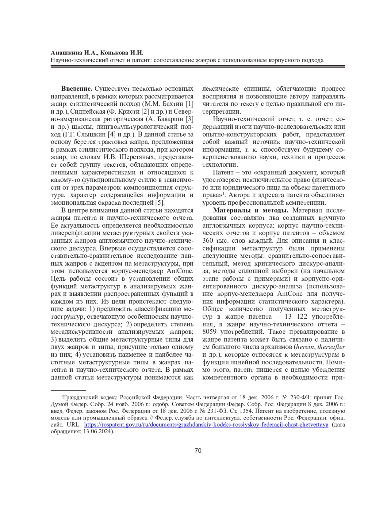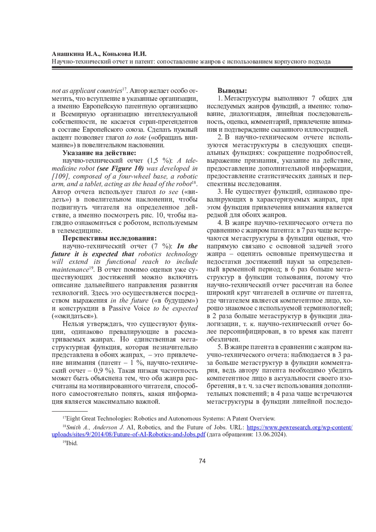 Статья посвящена анализу метаструктур современного англоязычного научно-технического дискурса на материале таких жанров, как научно-технический отчет и патент. Цель исследования - сопоставление метаструктур названных жанров с акцентом на такие функции, как диалогизация, линейная последовательность, подтверждение сказанного визуальным рядом, оценка, комментарий, толкование, привлечение внимания. Актуальность определяется необходимостью диверсификации метаструктурных свойств указанных жанров. Научная новизна исследования состоит в том, что в его рамках впервые осуществляется сравнительно-сопоставительный анализ метаструктур таких дискурсивных жанров, как научно-технический отчет и патент, посредством корпус-менеджера AntConc для установления функциональных характеристик метаструктур, что позволяет рассмотреть способы построения научно-технического дискурса с акцентом на категорию метадискурсивности. По результатам сравнительно-сопоставительного анализа делаются выводы о степени встречаемости в жанрах метаструктур и уровне метадискурсивности жанров. Помимо этого, описываются единые для обоих жанров функции метаструктур и функции, присущие только жанру научно-технического отчета, отмечаются самые популярные и менее употребляемые функции метаструктур в характеризуемых жанрах и предлагаются возможные причины такой частотности. Материал исследования включает тексты современных научно-технических отчетов и патентов, представленных корпусами объемом 360 тыс. слов каждый. Теоретическая значимость статьи состоит в диверсификации метаструктур и способов их употребления в жанрах англоязычного научно-технического дискурса. Практическая ценность связана с применением полученных результатов при самостоятельном составлении англоязычных текстов, относящихся к жанрам научно-технического отчета и патента, с целью построения успешной научной коммуникации.