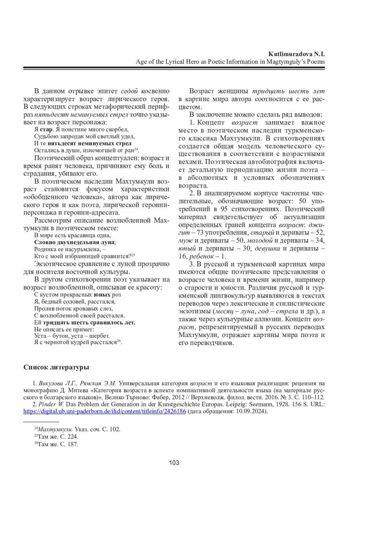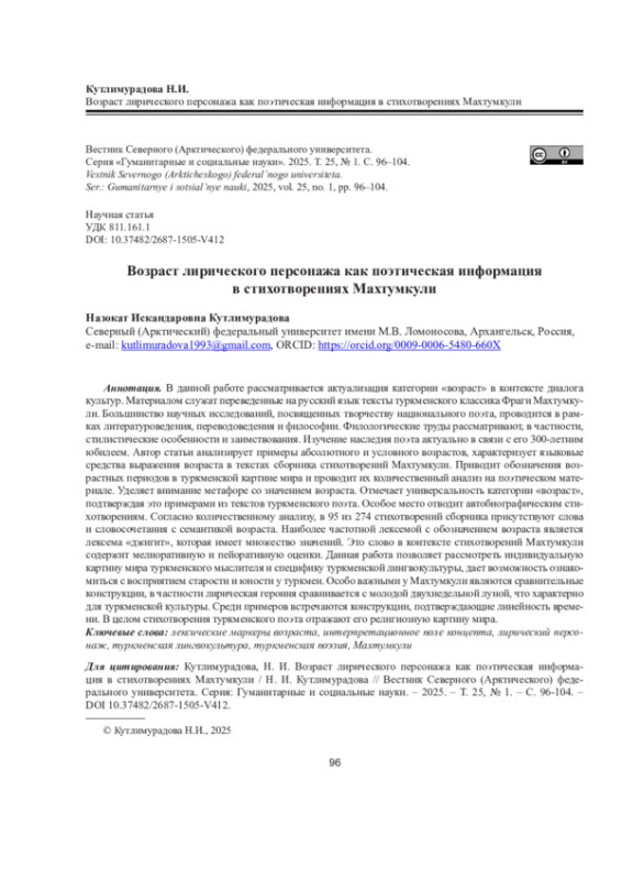 В данной работе рассматривается актуализация категории «возраст» в контексте диалога культур. Материалом служат переведенные на русский язык тексты туркменского классика Фраги Махтумкули. Большинство научных исследований, посвященных творчеству национального поэта, проводится в рамках литературоведения, переводоведения и философии. Филологические труды рассматривают, в частности, стилистические особенности и заимствования. Изучение наследия поэта актуально в связи с его 300-летним юбилеем. Автор статьи анализирует примеры абсолютного и условного возрастов, характеризует языковые средства выражения возраста в текстах сборника стихотворений Махтумкули. Приводит обозначения возрастных периодов в туркменской картине мира и проводит их количественный анализ на поэтическом материале. Уделяет внимание метафоре со значением возраста. Отмечает универсальность категории «возраст», подтверждая это примерами из текстов туркменского поэта. Особое место отводит автобиографическим стихотворениям. Согласно количественному анализу, в 95 из 274 стихотворений сборника присутствуют слова и словосочетания с семантикой возраста. Наиболее частотной лексемой с обозначением возраста является лексема «джигит», которая имеет множество значений. Это слово в контексте стихотворений Махтумкули содержит мелиоративную и пейоративную оценки. Данная работа позволяет рассмотреть индивидуальную картину мира туркменского мыслителя и специфику туркменской лингвокультуры, дает возможность ознакомиться с восприятием старости и юности у туркмен. Особо важными у Махтумкули являются сравнительные конструкции, в частности лирическая героиня сравнивается с молодой двухнедельной луной, что характерно для туркменской культуры. Среди примеров встречаются конструкции, подтверждающие линейность времени. В целом стихотворения туркменского поэта отражают его религиозную картину мира.