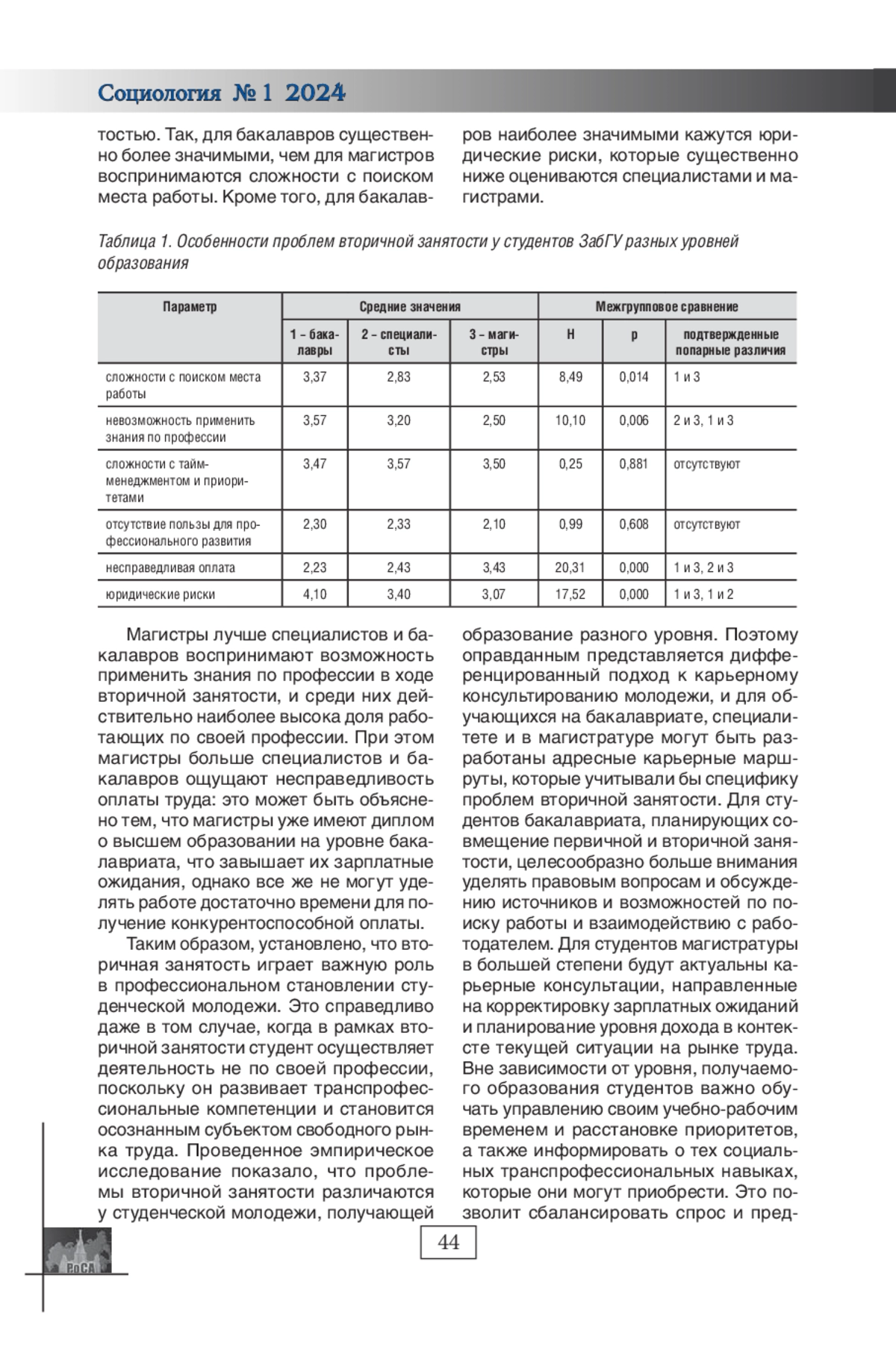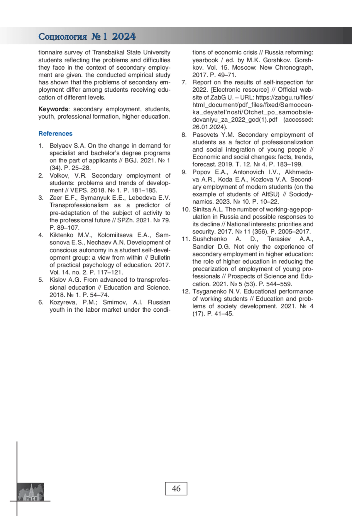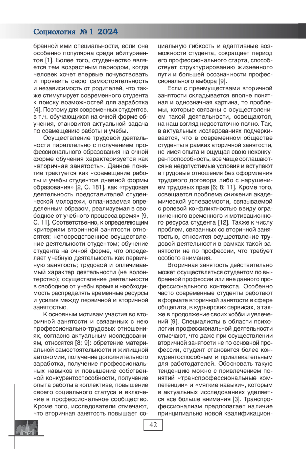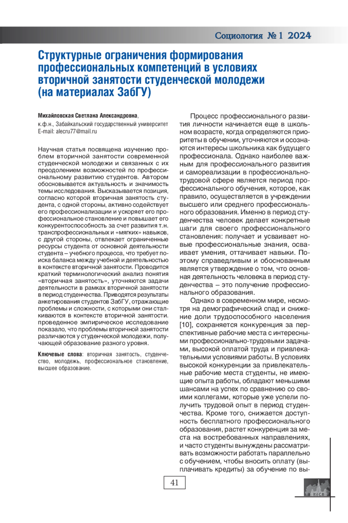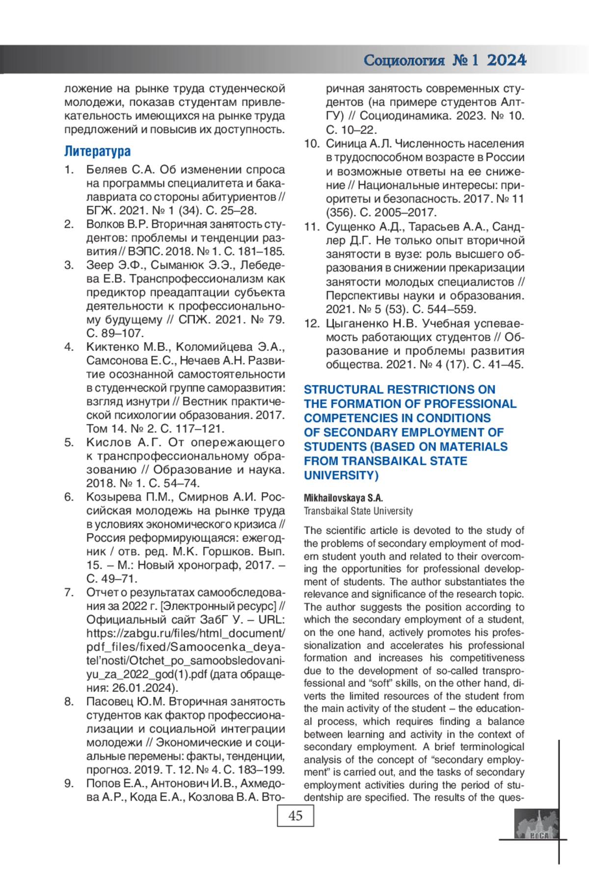 МИХАЙЛОВСКАЯ С. А. СТРУКТУРНЫЕ ОГРАНИЧЕНИЯ ФОРМИРОВАНИЯ ПРОФЕССИОНАЛЬНЫХ КОМПЕТЕНЦИЙ В УСЛОВИЯХ ВТОРИЧНОЙ ЗАНЯТОСТИ СТУДЕНЧЕСКОЙ МОЛОДЕЖИ (НА МАТЕРИАЛАХ ЗАБГУ) // СОЦИОЛОГИЯ. 2024. № 1